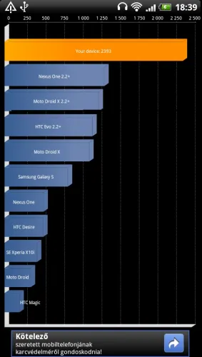 Sajnos a 25 százalékos gyorsulás sem elég arra, hogy a viszonylag réginek mondható architektúra (itt főleg az Adreno 220 GPU-ra gondolunk) sikerrel vegye fel a harcot például a Samsung hasonló SoC-ivel, de azért a különbség határozottan csökken. Quadrant alatt például 2393 pontot kaptunk (csak emlékeztetőül: a Sensation 1946-ot, a Galaxy S II viszont 3233-at „tud”), míg az AnTuTu Benchmark a következő értékekkel szolgált: