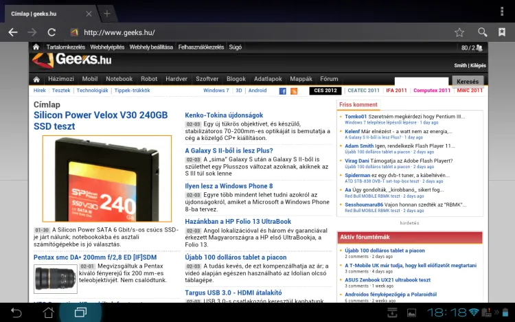 Az Ice Cream Sandwichben változott a böngésző, már, ha a gingerbreades állapotokat nézzük. Tablet fronton a 4.0 gyári böngésző nagyon hasonlít a Honeycomb kínálta szoftverre, de a programot hasonlíthatnák akár az asztali Google Chrome-hoz is, hiszen az elrendezés alapjait ez szolgáltatta. A felső, vékony sorban helyezkednek el a megnyitott oldalak, amelyeket egy mozdulattal tudunk elérni, illetve bezárni. A jobb felső sarokban három négyzetből álló oszlop jelöli a menüt. Erre kattintva több választási lehetőséget is találunk. A két legjobb újítás az Asztali webhely kérése és a Mentés offline olvasáshoz. Az előbbivel lehetőségünk van beállítani, hogy a megtekintett oldalak ne a mobilra optimalizált oldallal jelenjenek meg, hanem úgy, ahogy a számítógépünkön. Ez többek között a Facebook esetében is jól jön, a közösségi oldal mobilos verziója ugyanis eléggé használhatatlan. A másik menüpont menti a weboldalt, így azt a későbbiekben akkor is megtudjuk nyitni, ha nincs internetkapcsolatunk.