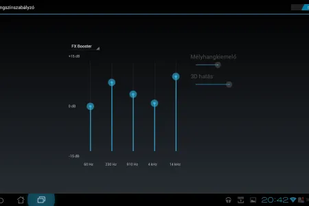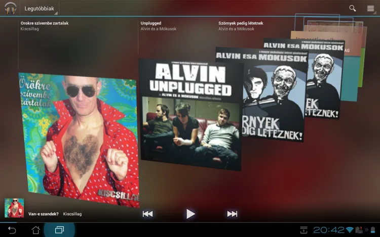 A zenelejátszó plusz szolgáltatásainak egyike az equalizer, amely több előre elmentett effektet tartalmaz, de magunk is állíthatunk be újat. A hangzással gond nincs, nagyon szépen szólaltatja meg a dallamokat a Prime, az egyetlen szívfájdító tényező, amit már korábban is írtunk, hogy csak egy hangszóró került a tabletre, így a térhatás mértéke egyenlő a nullával. A másik jó dolog az, hogy a nagyméretű zenelejátszó a lezáró képernyőről is elérhető, így az album borítóján keresztül vezérelhetjük az alkalmazás alapfunkcióit.