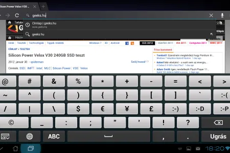 A Transformer Prime elsősorban a dokkolón lévő billentyűzettel operál, amily kiválóan használható, éppen úgy, mint egy igazi netbook klaviatúrája. De mi van, ha billentyűzet nélkül vettük, vagy éppen nincs nálunk, de írni szeretnénk? Akkor a szoftveres billentyűzetet is tudjuk használni. A szögletes gyári billentyűzet mellé az ASUS elkészítette a saját alternatíváját is, amely nagyméretű, világosszürke gombokat tartalmaz, öt sorban, legfelül a numerikus gombokkal. Sajnos a nagyméretű gombok azt is jelentik, hogy a magyar kiosztás ékezetes karakterei nem fértek ki.