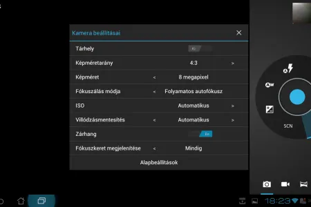 Az ASUS Eee Pad Transformer korábban nagyon csúnyán elvérzett a kamera tekintetében, hiszen csak 2 Mpixeles képérzékelőt kapott, ráadásul az sem volt túl jól használható. A Prime esetében sokat javított a tajvani gyártó, hátulra egy 8 Mpixeles kamera került, előre pedig 1,3 Mpixeles. A kamera alkalmazásában a jobb oldalon van a kezelőpanel, ahol középen egy kör közepén helyezkedik el a felvétel gomb. Körülötte van a zoom gyűrű, amivel a digitális nagyítást állíthatjuk. A beállításokban kép módot, fehéregyensúlyt és expozíciót is állíthatunk. Emellett a kamera beállításait is elvégezhetjük, mint a mentés helye, méretarány, képméret, fókuszálás módja, ISO, vagy éppen a zárhang.