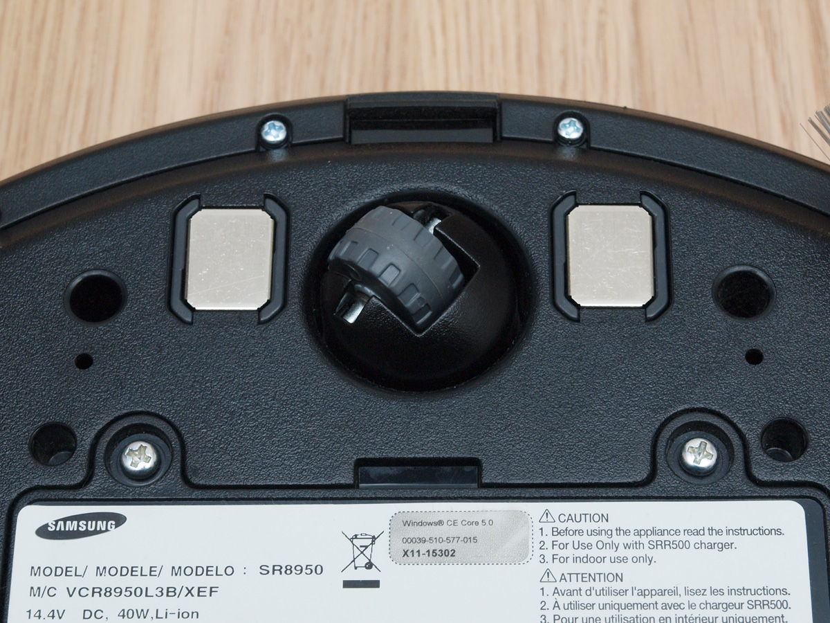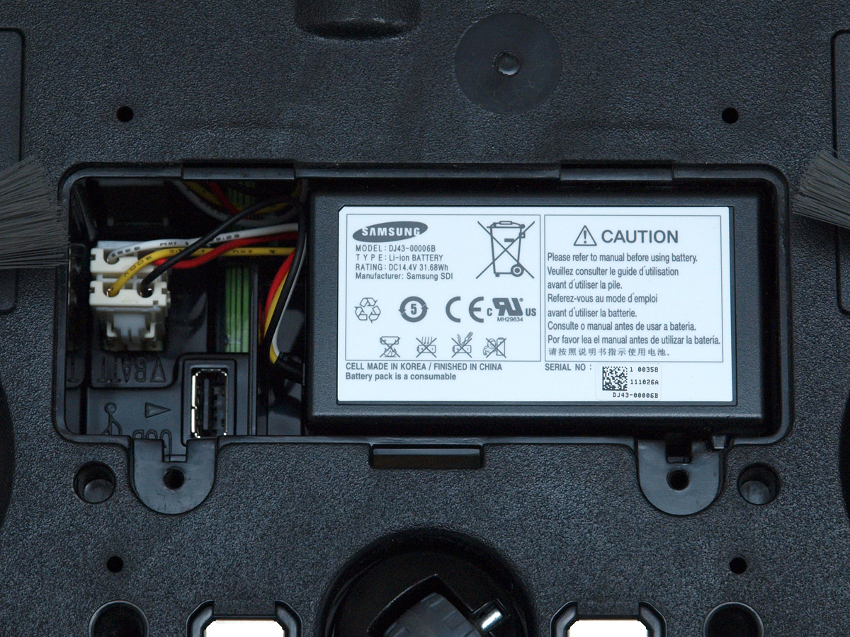 A Samsung Navibot S SR8950 áramellátásáról egy 14,4V-os Li-ion akkumulátor gondoskodik, ami akár a felhasználó által is cserélhető módon került a robotba. Az akkumulátort rejtő mélyedésben található még egy USB csatlakozó, ami valószínűleg szervizelésnél kap szerepet. Az eddig megjelent Samsung robotokhoz a gyártó legjobb tudomásunk szerint nem adott még ki szoftveres frissítést, ezért egyelőre nem feltételezzük, hogy ez a csatlakozó a robot belső szoftverének a felhasználó általi frissítésére szolgálna.