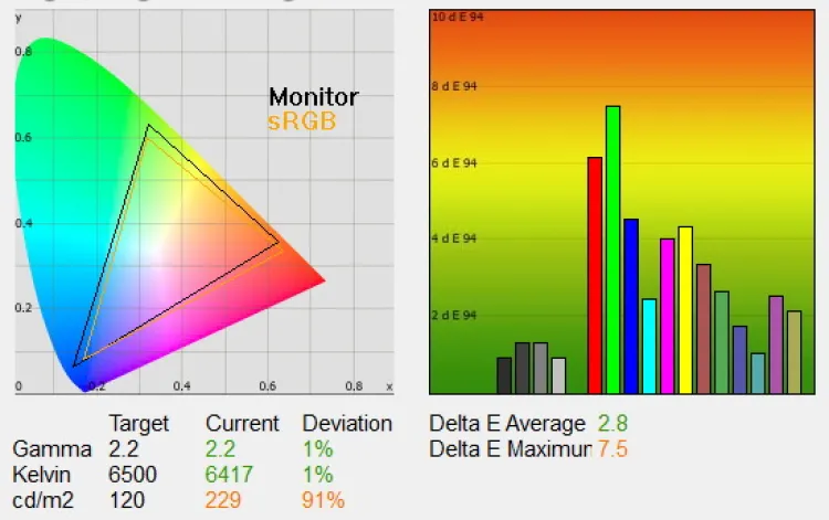 A kalibrátor segítségével lemértük a monitor színhelyességét is; összességében nem rossz az eredmény, a 3 alatti átlagos deltaE azt jelenti, hogy a megjelenített színek csak kis mértékben térnek el az elvárttól – a gamma és a színhőmérséklet tökéletesen rendben voltak.