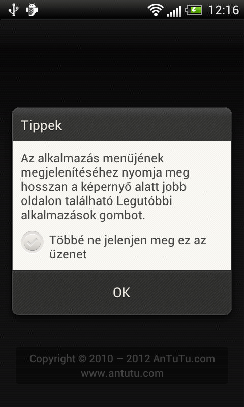 Ami rögtön feltűnhet, az az, hogy a rendszerben nincsen meg az Ice Cream Sandwich fix indítósávja, ami a gombokat tartalmazná – ahogyan korábban már említettük, ezek helyett a HTC valódi gombokat alkalmaz, így több a kijelzőn a hasznos terület. Hardveres menü gomb viszont nincsen, így, ha az alkalmazás megkívánja, sajnos a HTC is kénytelen az alsó részt levágni. Kicsit fura, hogy ilyenkor a képernyő teljes alsó sávja gyakorlatilag egyetlen funkciót lát el – kétségtelenül nem a legjobb megoldás. A Sense 4.0 a One V esetében azoknál a régebbi alkalmazásoknál, amelyek nem kérik a menü gombot, nem is teszi oda; ezeknél a feladatváltót kell hosszan nyomva tartani a menü behívásához. Erre minden alkalmazásnál figyelmeztet is a telefon – ha akarjuk, akkor csak az első indításnál, ha akarjuk, akár minden alkalommal.