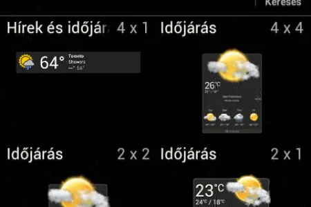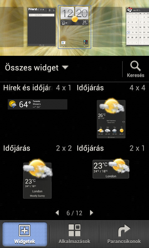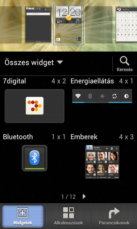 A HTC nemcsak a felület testreszabhatóságával, hanem a widgetek széles tárházával is jeleskedik, bár a One V esetében csak 46 minialkalmazás közül tudunk választani. A widgetek elhelyezésére használható képernyőn felül a kezdőképernyők, alatta pedig a widgetek látszanak, így utóbbiak elhelyezése gyorsan és egyszerűen történhet.
