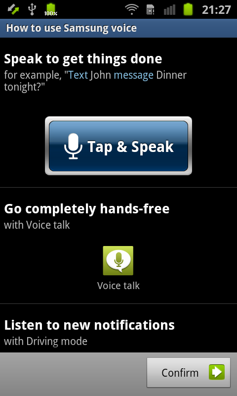 A Samsung már a Galaxy S Advance-ba is beépítette a hangvezérlés lehetőségét, azonban természetesen nem a Galaxy S III-ban lévő, felhőben működő S Voice-ról van szó, hanem arról, hogy több parancsot nyomkodás helyett beszéddel is elérhetünk.