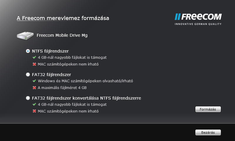 Ehhez használhatjuk az operációs rendszerünkbe épített lehetőséget vagy a Freecom saját programját is – utóbbit a cég honlapjáról lehet letölteni. Hasznos lehet, hogy a Freecom alkalmazása megmondja, milyen előnyei vannak annak, ha az NTFS illetve a FAT-32 fájlrendszert választjuk. A program a formázáson kívül arra is használható, hogy a FAT-32 fájlrendszerre formázott Freecom meghajtót NTFS-re konvertáljuk át.