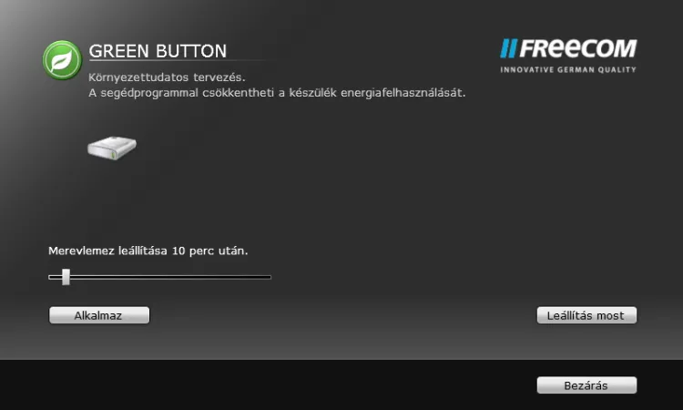 A gyártó honlapjáról egy másik alkalmazást, a Green Button nevű programot tölthetjük még le a Mobile Drive Mg-hez (a formattálóhoz hasonlóan Windows és Mac verzió is elérhető), amellyel azt állíthatjuk be, hogy a HDD mennyi idő eltelte után menjen el készenléti állapotba (azaz a HDD mikor kapcsoljon ki). Az időtartamot 5 és 120 perc között választhatjuk meg. A Green Button a Windows indításakor egyébként betelepszik a tálcára, ahonnan arra is lehetőséget ad, hogy a meghajtót egyetlen gombnyomással azonnal alvó módba küldjük.