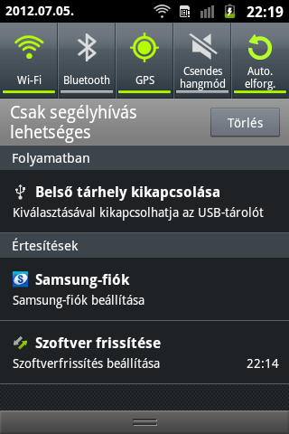 A feladatváltó a középső gomb nyomva tartásával érhető el, külsőre semmi különöset nem kapunk, de az ikonok ablakban jellegű felület a célnak így is tökéletesen megfelel. A Samsung az értesítési sávot is átdolgozta kis mértékben; legfelül gyorsgombokat kapunk a WiFi, a Bluetooth, a GPS, a csendes üzemmód és az automatikus elforgatás ki- és bekapcsolásához.