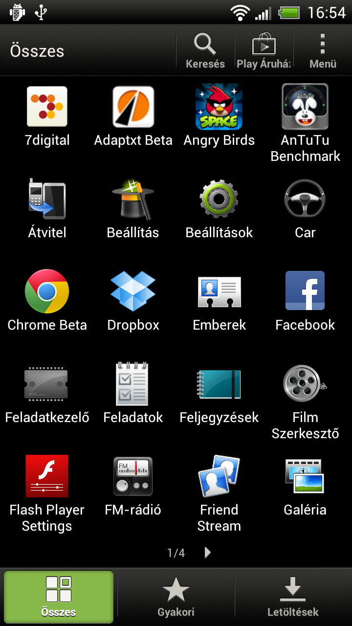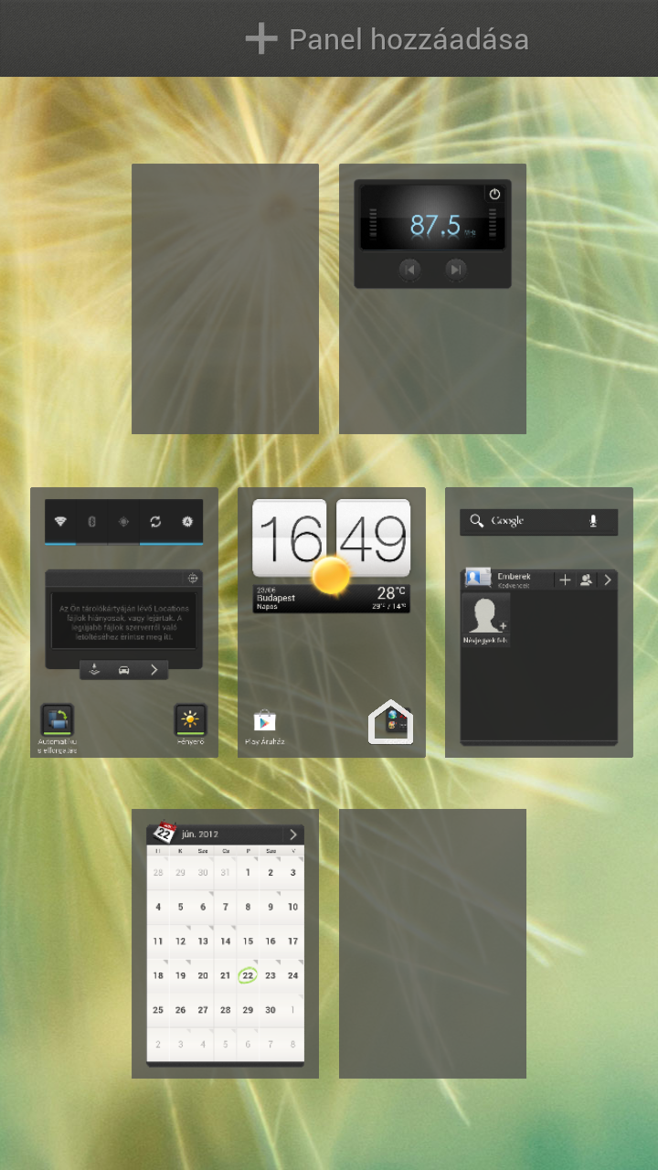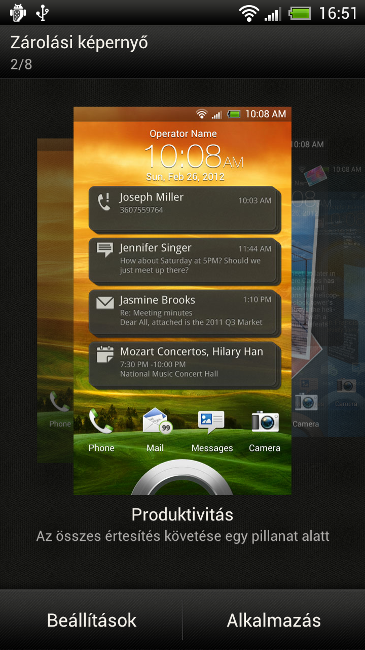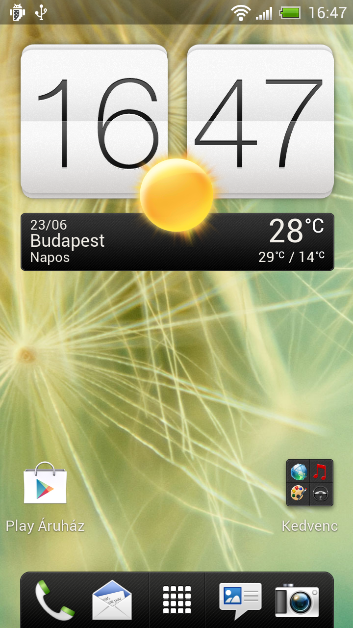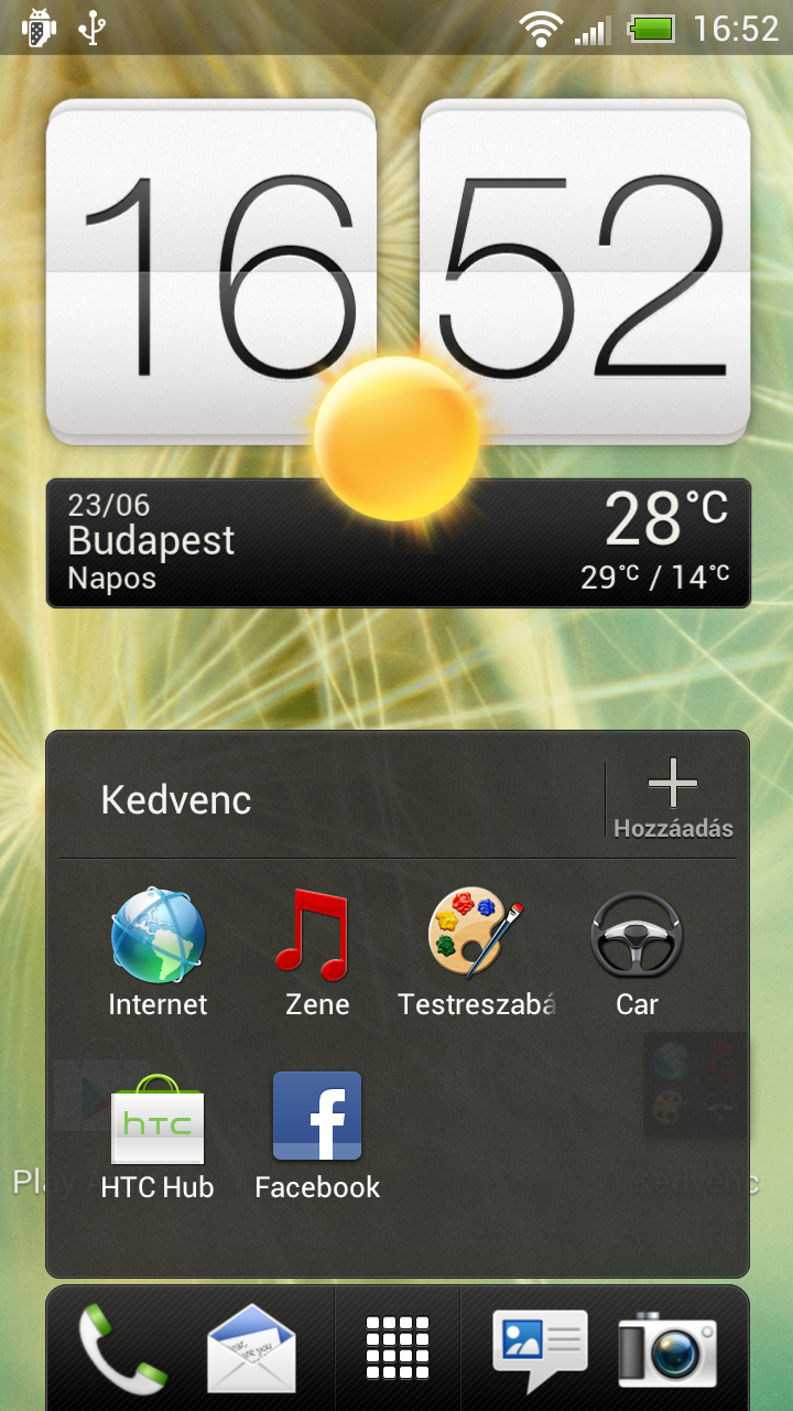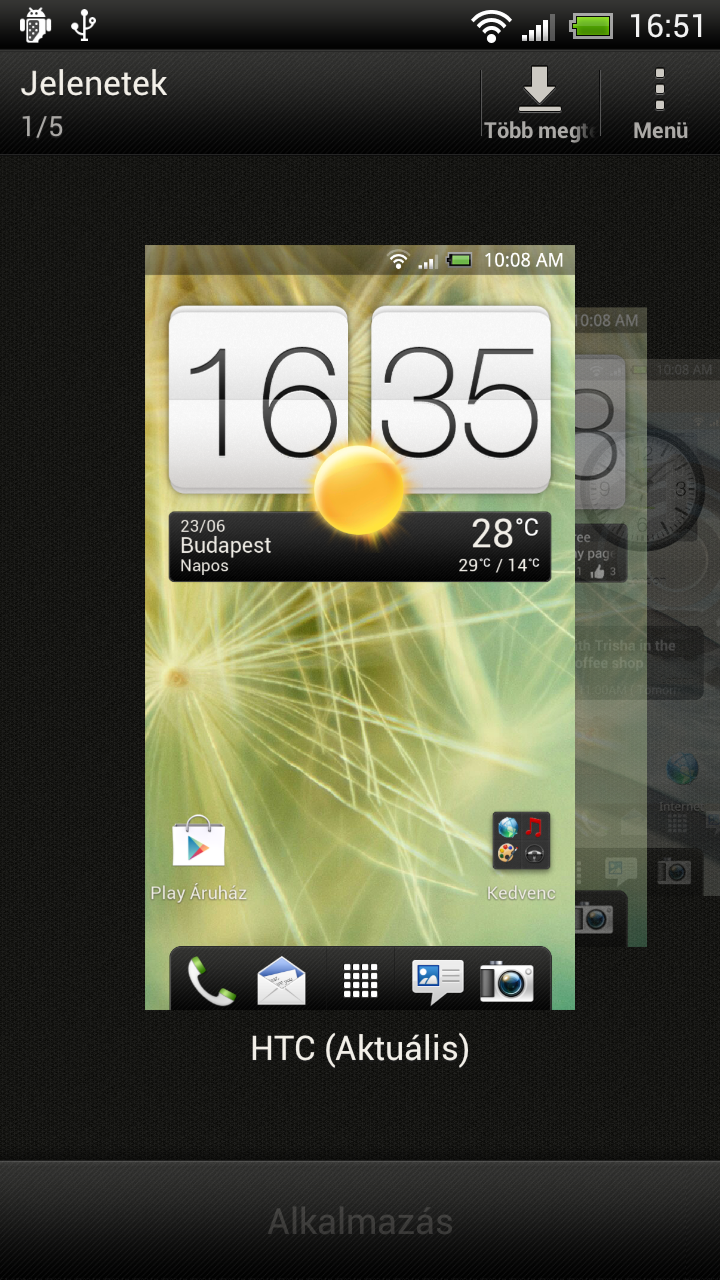 Főképernyőből a One X esetében maximum hetet használhatunk, ha ennél kevesebbre van szükségünk, akkor a feleslegeseket pedig természetesen eltávolíthatjuk. Egy képernyőn sajnos csak 4×4 ikonnyi terület van, pedig nem lett volna zsúfolt az összhatás akkor sem, ha egy sorral többet használhatunk – sőt a 4,7 colos kijelző, főleg a HD felbontással, meglehetősen szellősnek hat. A nagy widgetek (pl. naptár) esetében ennek persze nincsen jelentősége, viszont nem lenne rossz, ha a HTC tulajok kedvenc órája alá nem két, hanem három sor fért volna be. A főképernyők közötti váltás ötletes 3D effektussal történik, mintha egy kockát forgatnánk (azzal a különbséggel persze, hogy a valóságban nyilván nincsen olyan kocka, amelyiknek hét oldala lenne). A HTC eltűntette annak lehetőségét, hogy a jobb szélről jobbra továbbhaladva a bal oldalai lapra ugorjunk (és vissza), viszont a gyártó jó szokásához híven a kezelőfelület gyakorlatilag minden elemét testreszabhatjuk, a háttérkép megváltoztatása mellett akár azt is egyedileg beállíthatjuk, hogy a lezáró képernyőn milyen információk jelenjenek meg (pl. hívásnapló, fotók, tőzsdeinformációk). A lezáró képernyő emellett négy ikont is tartalmaz; ha a feloldó kör felhúzása helyett valamelyik ikont húzzuk bele a körbe, akkor az adott alkalmazás rögtön el is indul. Természetesen változtatható, hogy milyen ikonok kerüljenek ide, azonban nem teljesen szabadon: itt éppen azokat a programokat látjuk, amelyeket a főképernyő alsó gyorsindító sávjából érhetünk el. Ez a gyorsindító az alkalmazások gombot fixen tartalmazza, mellé négy további appot szúrhatunk be.