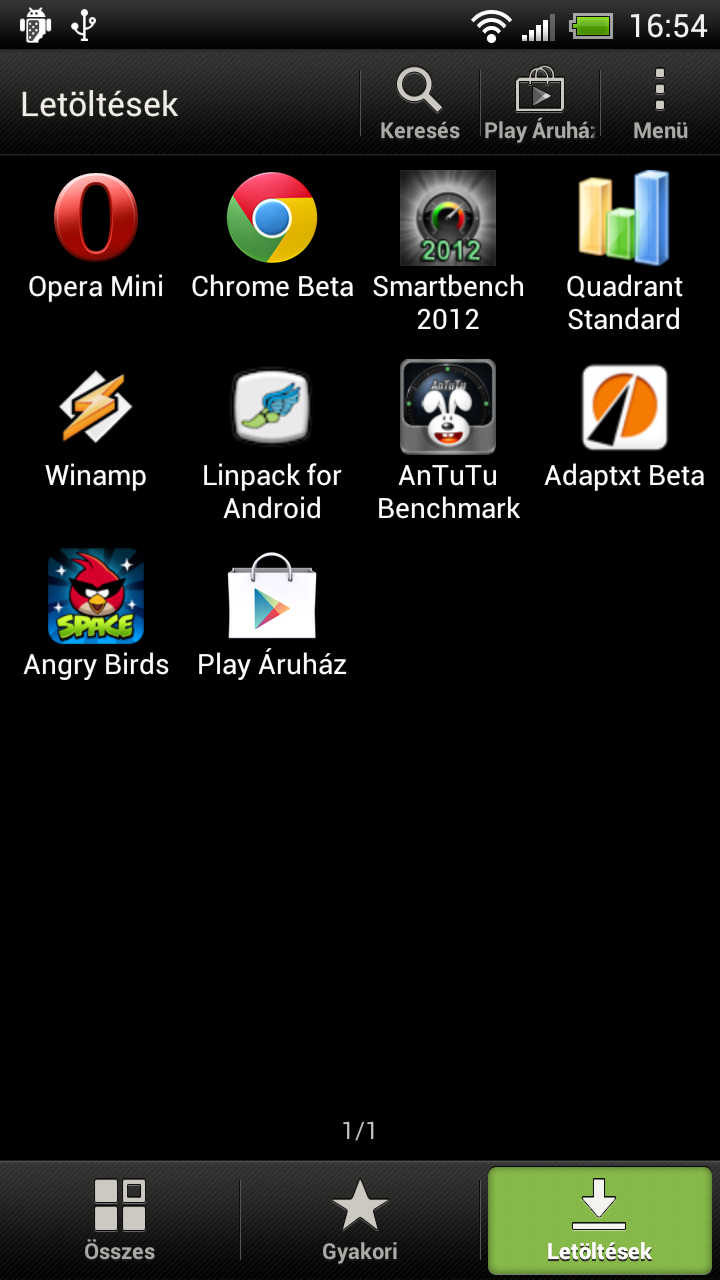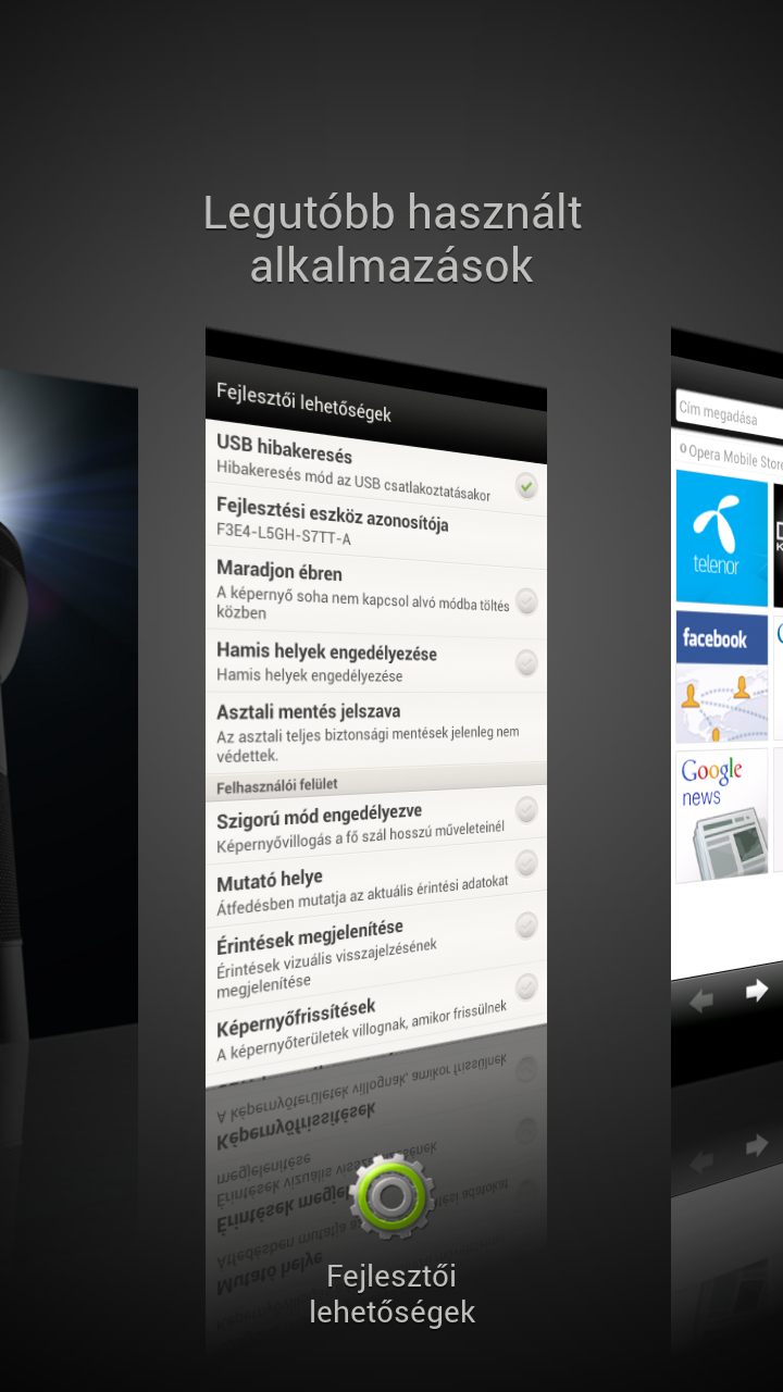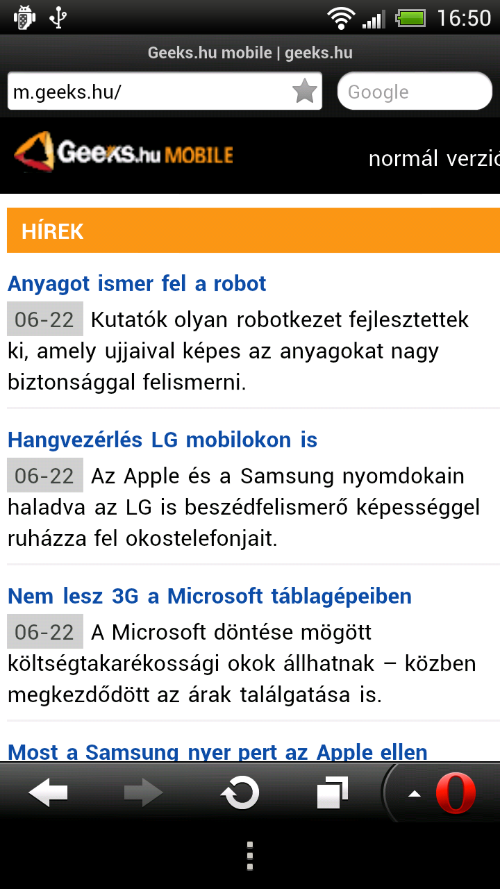 Ami rögtön feltűnhet, az az, hogy a rendszerben nincs meg az a fix sáv, ami a gombokat tartalmazza az Ice Cream Sandwich OS alatt – ahogyan korábban már említettük, ezek helyett a HTC valódi gombokat alkalmaz, így több a kijelzőn a hasznos terület. Menü gomb viszont nincsen, így, ha az alkalmazás megkívánja, sajnos a HTC is kénytelen az alsó részt levágni. Kicsit fura, hogy ilyenkor a képernyő teljes alsó sávja gyakorlatilag egyetlen funkciót lát el, de a helyzet még inkább faramuci akkor, ha amúgy a menü gombra szükség sem lenne; az Opera Mini egy tökéletes példa arra, amikor a menü gomb teljesen feleslegesen foglalja a helyet, lévén, hogy, ha megnyomjuk, akkor sem történik semmi. Kétségtelen, hogy nem ez a legjobb megoldás, arról viszont megoszlanak a vélemények, hogy ez a verzió jobb-e, vagy a One V esetében alkalmazott, amikor is a menü gombot az alkalmazásváltó hosszú nyomva tartásával helyettesíthetjük. Úgy látszik azonban, hogy ez a megoldás nemcsak nekünk nem tetszett, mert a HTC a Sense 4.1-ben megváltoztatta a menü gomb kezelését; a telefonon beállíthatjuk, hogy a feladatváltó eredeti funkciója helyett inkább a menüt hívja elő, így eltűntethetjük a régebbi appokból a ronda fekete sávot. Emellett úgy is beállíthatjuk a telefont, hogy rövid nyomásra a feladatváltó, hosszú váltással a menü funkció legyen aktív – vagy fordítva.