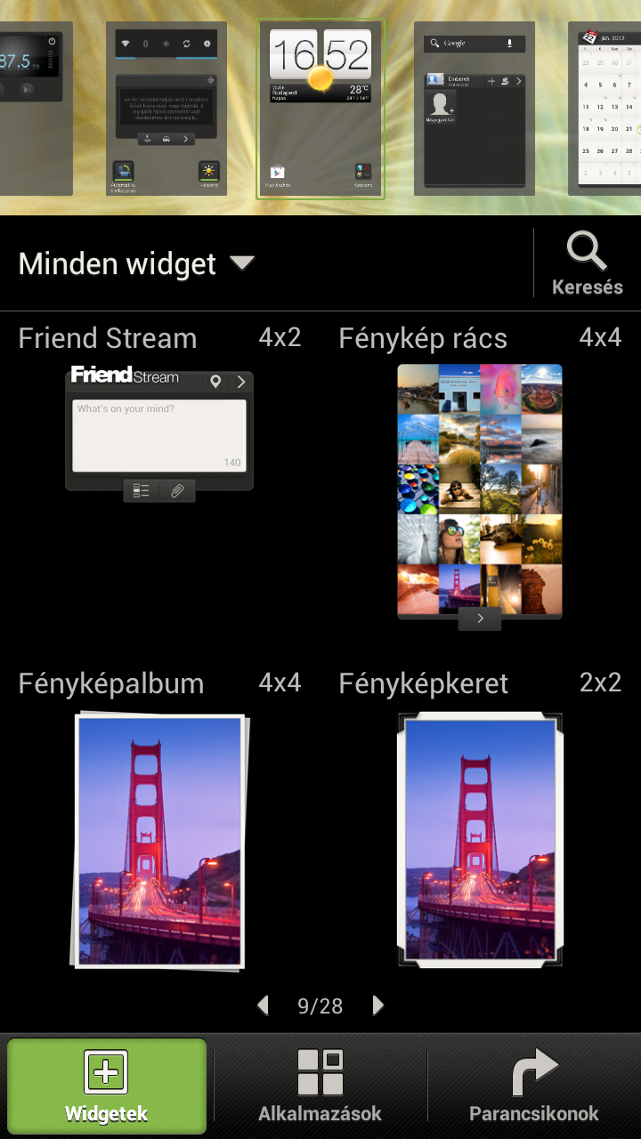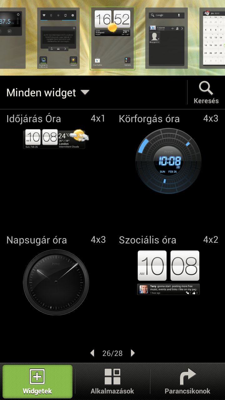 A HTC nemcsak a felület testreszabhatóságával, hanem a widgetek széles tárházával is jeleskedik, és ez nincsen másképpen a Sense 4.0 esetében sem. Összesen nem kevesebb, mint 100 féle widget áll rendelkezésre – annyi csalás azért van a dologban, hogy míg korábban az óra egy widgetnek számított, amely többféle külsőt is felölthetett, az új Sense-ben ezek mindegyike külön minialkalmazásként szerepel. A widgetek elhelyezésére használható képernyőn felül a kezdőképernyők, alatta pedig a widgetek látszanak, így utóbbiak elhelyezése gyorsan és egyszerűen történhet.