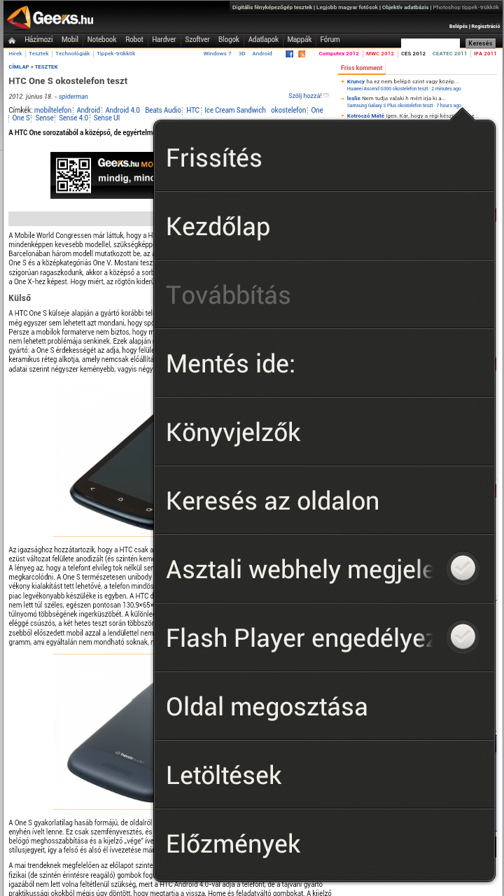 A HTC a böngészőt is több érdekes plusz funkcióval vértezte fel a gyári változathoz képest. Egyetlen gombnyomással lehet például ki-bekapcsolni a Flash támogatást, és ugyanilyen egyszerűen válthatunk a mobil illetve asztali böngészőre optimalizált változatok között – feltéve, hogy az adott weboldal ezt támogatja. A motor ettől függetlenül a stock Android változat; támogatja több fül egyidejű használatát, van benne inkognitó mód is és a Labs bekapcsolása után a képernyő bal vagy jobb szélén végighúzva az ujjunkat a Google új gyorsmenüje is megjelenik.