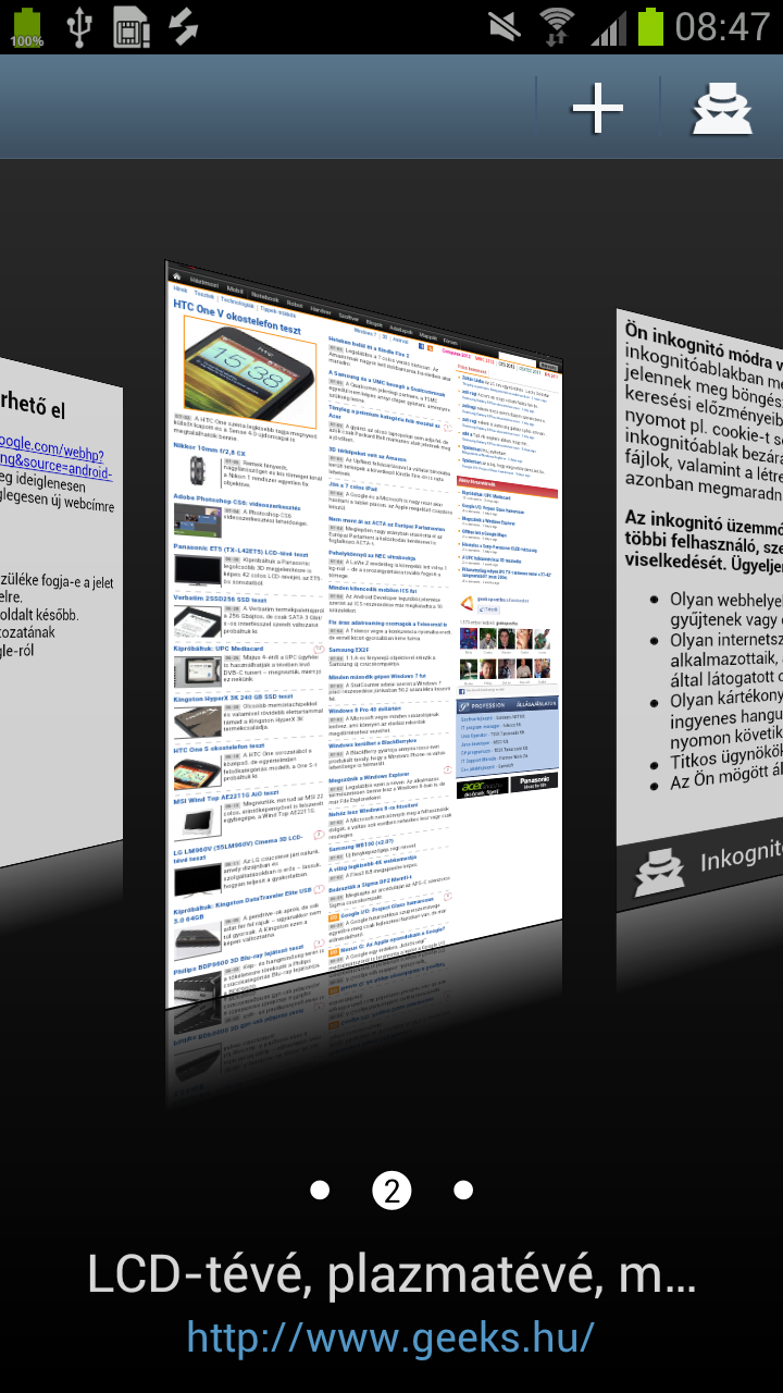 A Galaxy S III böngészője az alap Androidból származik, de a Samsung több érdekességgel is bővítette tudását. Egyrészt van Flash-támogatás, másrészt a csiptetős zoom segítségével a füleket áttekintő nézetre is válthatunk. A legtöbb weboldal állított helyzetben is olvasható méretben fér ki a telefonra, igaz, a betűk annyira aprók, hogy szinte csak nagyítóval lehet ilyenkor az irományokat elolvasni. A Samsung természetesen megoldotta, hogy a böngésző a szövegeket újratördelje, így az olvasás a legtöbb weboldal esetében azért nagyon kényelmesen megoldható. A szoftver sebességére egyáltalán nem lehet panaszunk, a négy processzormag valósággal feldobálja a weboldalakat a kijelzőre, még akkor is, ha összetettebb site-okról van szó.
