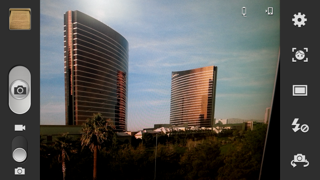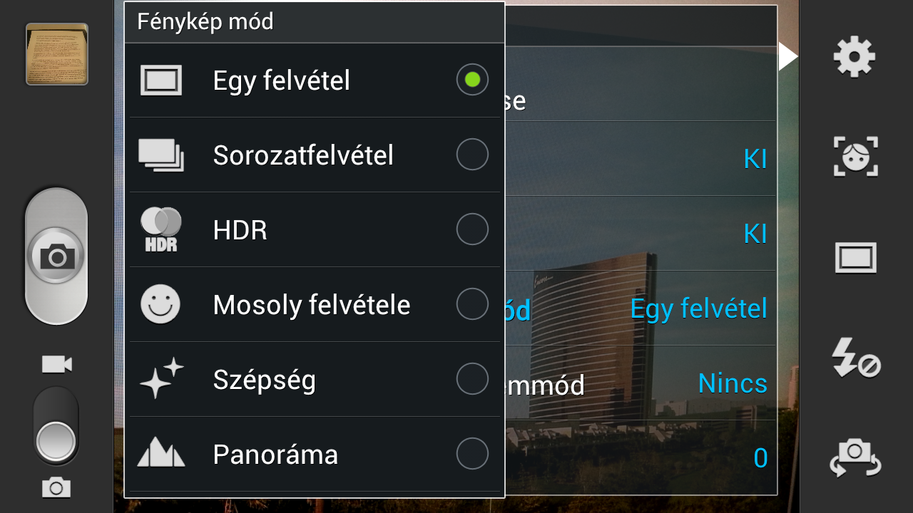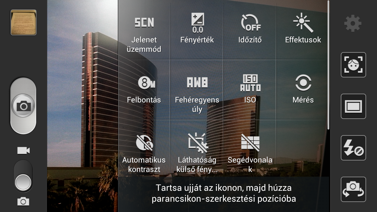 A fő kameramodul ugyanúgy egy 8 Mpixeles érzékelőt tartalmaz, mint a Galaxy S II esetében, azonban a Samsung a képminőségen elég sokat javított. A kamera természetesen autofókuszus, amelynek érdekessége, hogy az élességállítás folyamatosan működik. Ahogyan az első oldalon írtuk, a fényképezőgéphez LED-es vaku is tartozik, így elvileg sötét helyen is van esély arra, hogy használható képet tudjunk készíteni. A felület természetesen nem gyári androidos, ami a használhatóságon nagyon sokat dob, mert a Samsung rengeteg extra funkciót pakolt a gépbe. Közülük a bal oldalra összesen négyet tudunk kipakolni, egyéni ízlésünknek megfelelően – a beállításokhoz vezető, ötödik gomb helye viszont fix. A jobb oldali sáv tartalmazza a fénykép/videó váltás gombot és az exponálót (videó esetében a felvételindítót), valamint innen indíthatjuk el a galériát is, ha a korábban készített képeinket akarjuk megnézni.