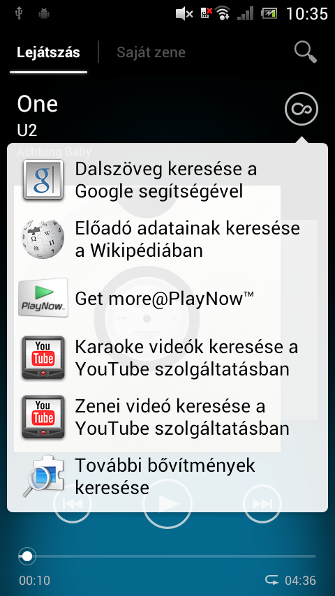 A Sony az Xperia J zenelejátszójára is ráaggatta a Walkman nevet, ami csak jót jelenthet. És valóban, a telefonban az egyik, ha nem a legjobb zenelejátszót kapjuk (nyilván a Sony jobb modelljeiben is ugyanezt a szoftver teljesít szolgálatot). A hangminőség nem csak mobilos mércével jó, hanem általánosságban is, és kapunk egy csomó extra funkciót is. Ilyen például az, hogy a zenelejátszó az értesítési tárhelyről és a lezáró képernyőről is vezérelhető, de említhetjük itt akár az éppen hallgatott szám like-olásának lehetőségét vagy a kapcsolódó keresési lehetőségeket is (YouTube, dalszöveg, előadó adatai).
