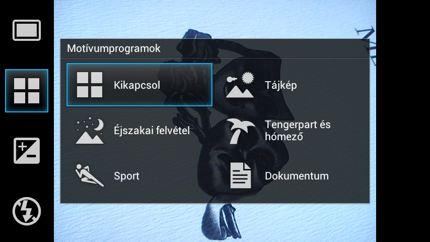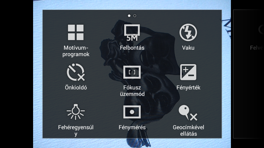 A kezelőszervek éppen kézre állnak: balra négy gyorsgomb, jobbra a fényképező/kamera váltó valamint az exponáló gomb található, a részletes beállítási lehetőségeket pedig a menü gombbal hívhatjuk be. A fícsörlistában panoráma mód, vörösszem csökkentés, jelenetek, fehéregyensúly, önkioldó és geocímkézés is szerepel.