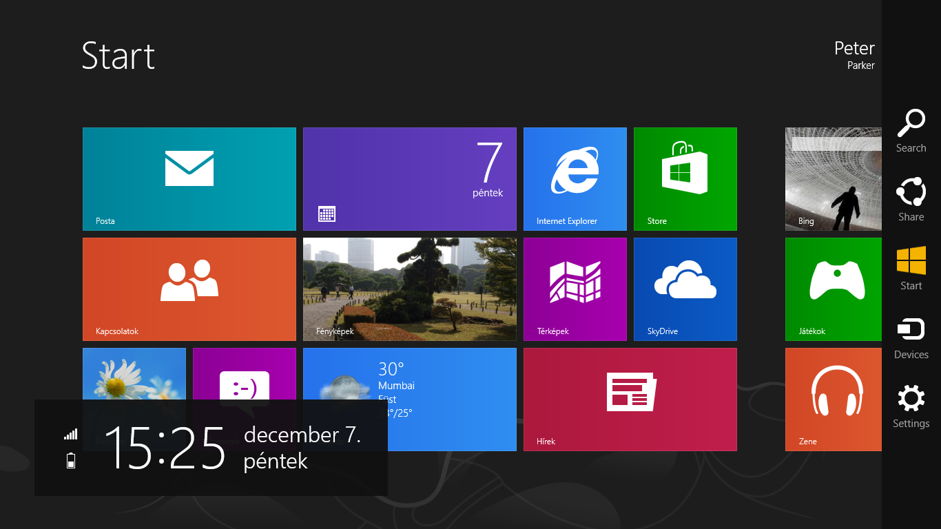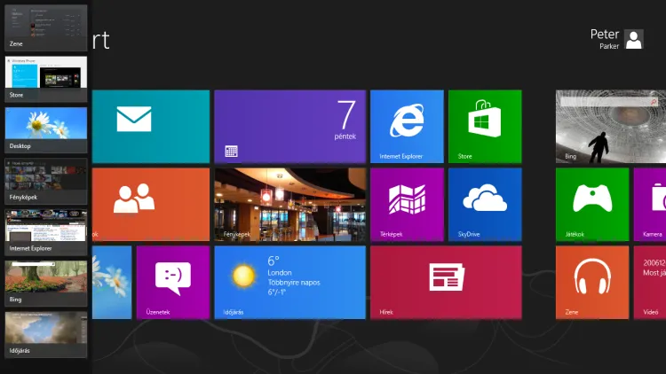 A csiptetős zoom is működik a Start képernyőn is, ha kicsinyítünk, akkor az ikoncsoportok közül tudunk gyorsabban választani. Az OS-t a képernyő oldalairól behúzható eszköztárakkal kezelhetjük: jobbról a Charmok, balról a feladatkezelő (vagy inkább alkalmazásváltó), lentről a helyi menü simítható be, a fentről indított ujjmozdulattal pedig az alkalmazások bezárására van módunk.
