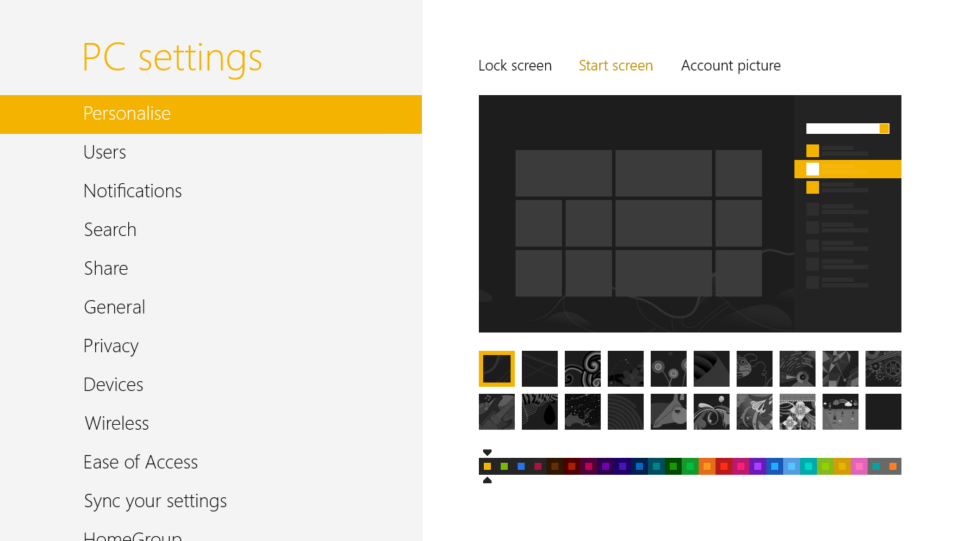 Természetesen a Windows RT esetében is személyre szabható a kezelőfelület – mindkettő. A Metro UI esetében többféle, előre definiált háttér és színséma közül választhatunk, saját tapétát azonban nem állthatunk be. A klasszikus Desktop felületen viszont minden olyan lehetőség elérhető, ami a Windows 8-ban. Az eszközbeállítások közül a fontosabbakat a Start képernyőn a nevünkre kattintva érhetjük el (vagy a jobbról behúzható Charmok segítségével), de a Windows RT-ben is van Control Panel (Vezérlőpult), amely további opciókat rejt.