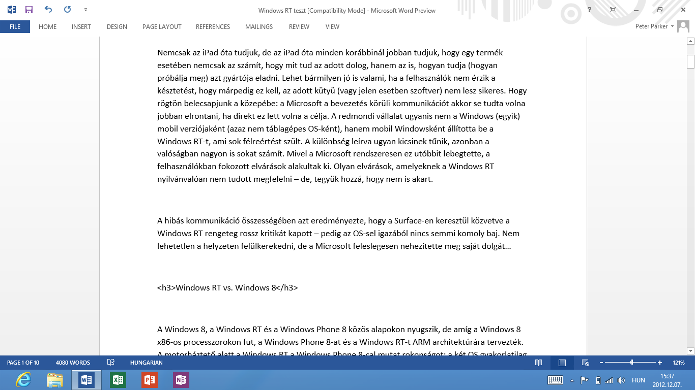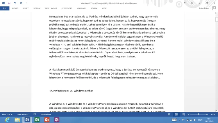 A táblagépre feltelepíthető alkalmazások ugyanis csak és kizárólag a Metro felületet használhatják, így a klasszikus felépítésű programok közül azokra hagyatkozhatunk, amelyek eleve a tableten vannak. Közülük a Word, az Excel, a PowerPoint és a OneNote azok, amelyekre talán a legnagyobb szükség lehet – egyébként ezekre sem azért, hogy a táblagéppel több oldalas dokumentumokat készítsünk, hanem azért, mert a Microsoft programjai garanciát jelentenek arra, hogy tableten is minden pontosan úgy jelenik meg, ahogyan az otthoni/irodai gépen. Emellett persze jól jöhet, hogy a dokuemtumokat szerkeszteni is lehet, de a táblagép elsősorban tartalomfogyasztásra való, nem pedig azok előállítására – újabb hiba, hogy a Microsoft kommunikációja szerint a Windows RT-s gépek tartalomgyártásra is alkalmasak, ám a helyzet semmivel sem jobb, mint az iOS-t vagy Androidot használó kütyük esetében.