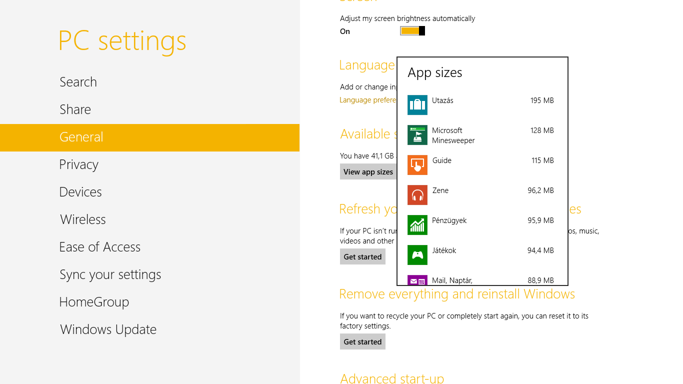 A jobbról behúzható eszköztár beállítások menüje néhány gyakran használat funkcióhoz nyújt gyors elérést. A legfontosabb talán az, hogy innen is menedzselhetjük a WiFi hálózatokat, itt tudjuk a fényerőt állítani és itt tilthatjuk le a képernyő automatikus elforgatását is – valamint a gép kikapcsolására is van mód, de a Windows RT esetében erre nincs igazából szükség. Az OS egyébként támogatja a Connected Standby készenléti állapotot is, ilyekor a tablet időnként „felébred”, leszedi a frissítéseket, majd visszalép alvó állapotba.