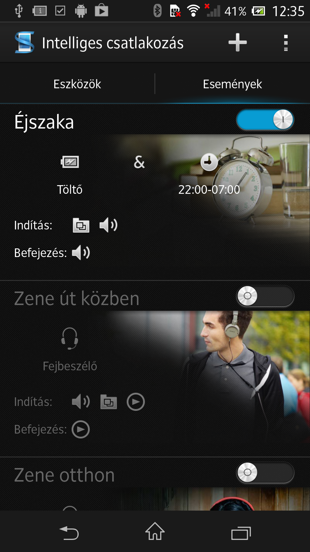 A LimeWire-t az Intelligens Csatlakozás váltotta, de funkciója ugyanaz: meghatározhatjuk, hogy egyes perifériák csatlakozásakor milyen alkalmazás induljon el – ez hasznos opció, hiszen segítségével a fülhallgató bedugása után például automatikusan indulhat a Walkman. Az új app annyi extrával bír, hogy a csatlakozásokhoz eseményeket is rendelhetünk, a töltő csatlakozása például energiatakarékos, éjszakai módba tudja küldeni a mobilt. Az események természetesen nemcsak a perifériák csatlakoztatásakor aktiválhatók, hanem időzítővel is.