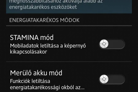 A fő lehetőségek: STAMINA mód, Merülő akku mód és Helyalapú WiFi. A STAMINA mód minden háttérben futó folyamat adatforgalmazását leállítja, ha elsötétül a kijelző (kivételek megadhatók), a Merülő akku mód pedig (ha aktiváljuk), 30%-os töltöttségi szint alatt kapcsol ki egyes fogyasztókat (megadható, hogy mit). A helyalapú WiFi a cellainformációk alapján azonosítja a WiFi hálózatokat, és csak akkor próbál meg kapcsolódni, ha egy mentett WiFi hálózat „körzetében vagyunk”.