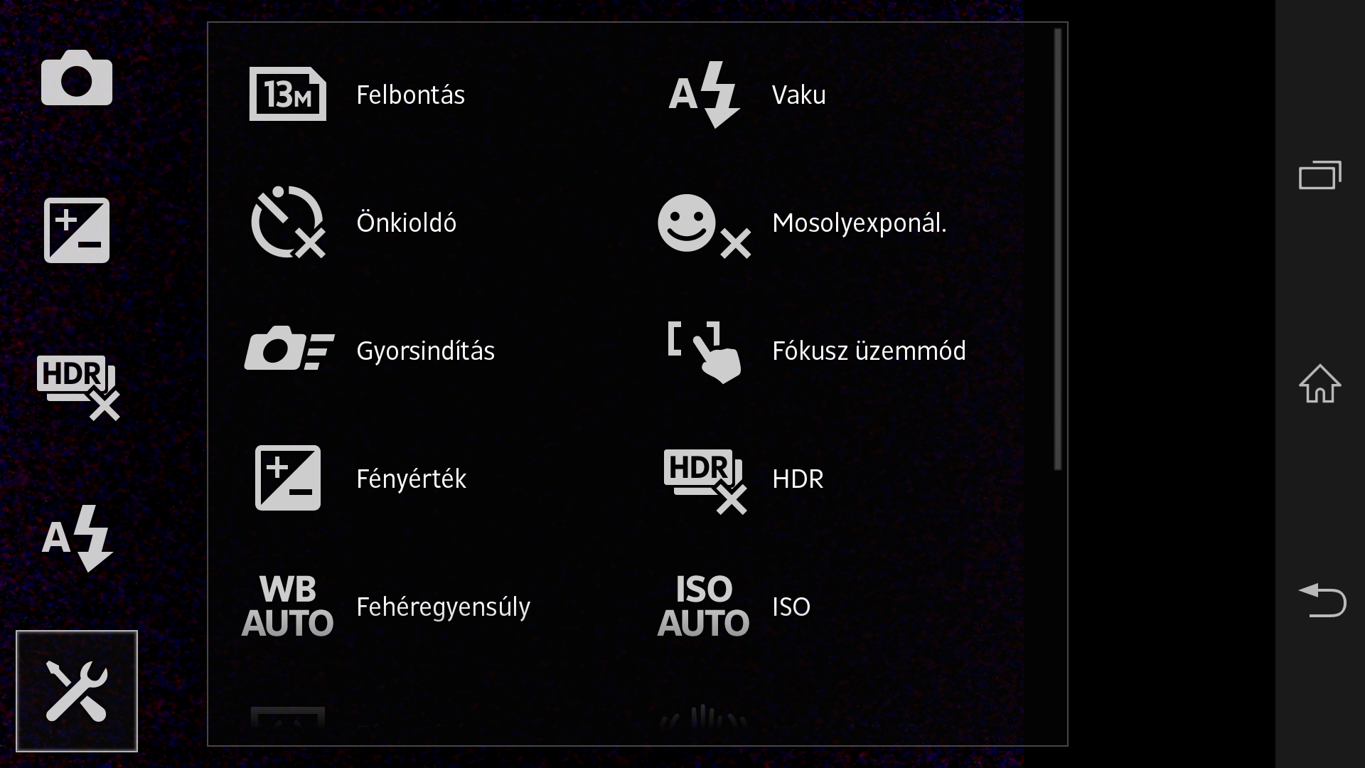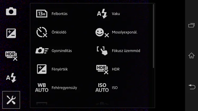 És a kamera szoftvere is érdekesen működik: ha lezárt kijelzővel indítjuk el, akkor gyakorlatilag csak exponálni tudunk, minden más esetben (pl. fotók visszanézése, beállítások) kidob a szoftver a lezáró képernyőre, ahol fel kell oldanunk a telefont „rendesen” is, mielőtt továbbmennénk. Beállítási lehetőségből rengeteg van, természetesen a fehéregyensúly, az EV, és az ISO is állítható, van gyors sorozatfelvétel (9MP), HDR mód, elektronikus képstabilizátor, időzítő, geotagging és mosolygásra aktiválódó képkészítési lehetőség is.