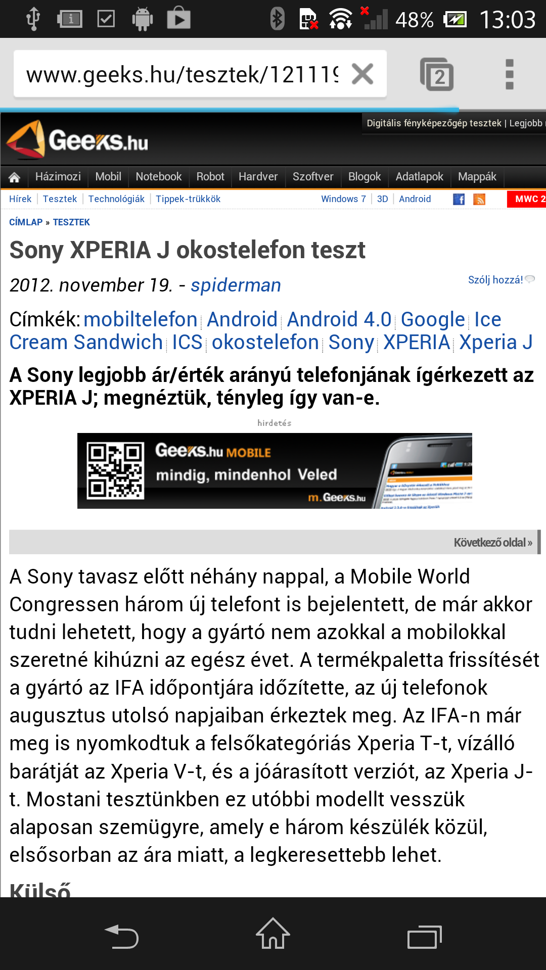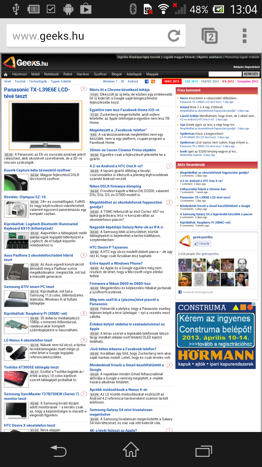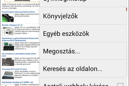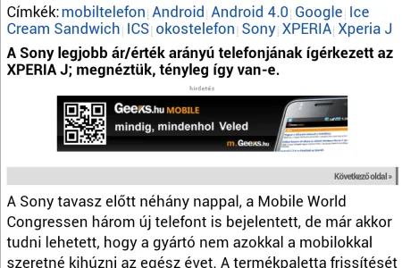 Flash az Android 4.1 miatt nincsen, az újratördelés viszont, a telefon elforgatásakor, működik. Emellett megadható az is, hogy mekkora legyen a betűméret – a böngésző megpróbálja kitalálni, hogy melyik a tartalmi rész, és itt a css információkat felülírva nagyobb betűméretet állít be a könnyebb olvashatóság érdekében.