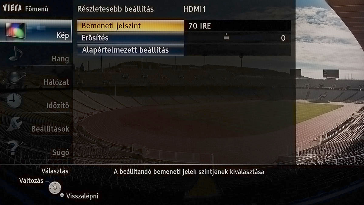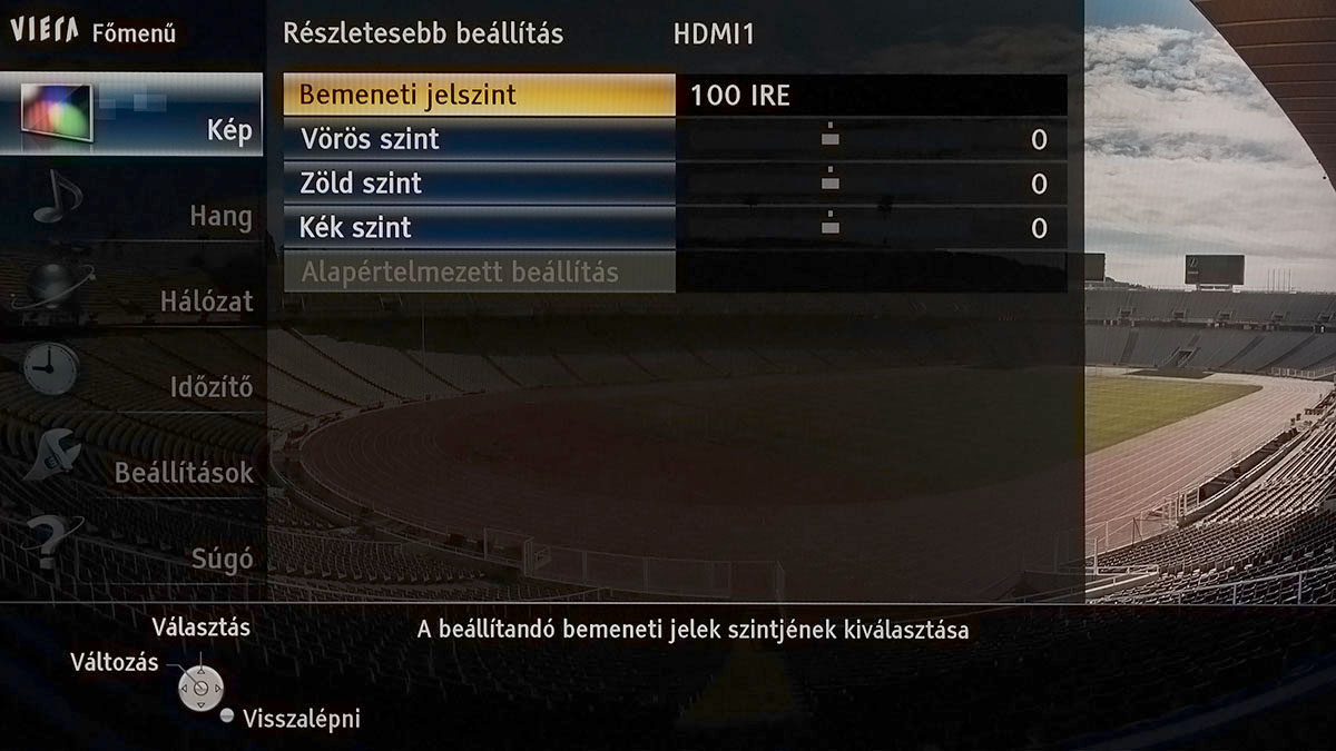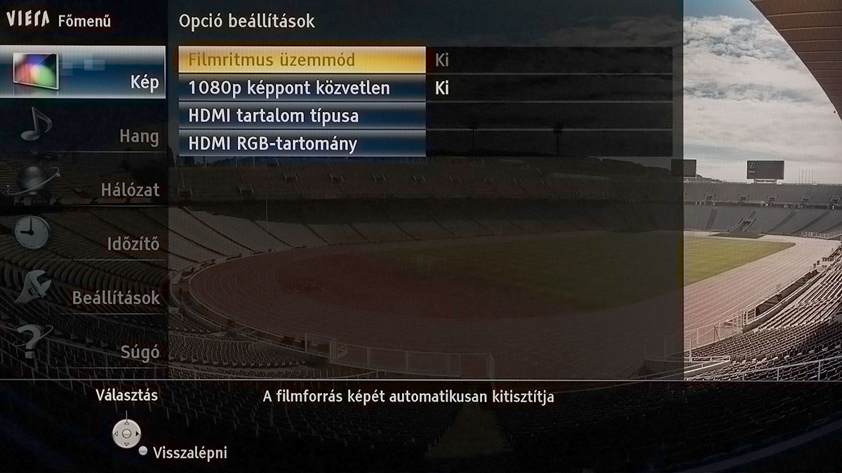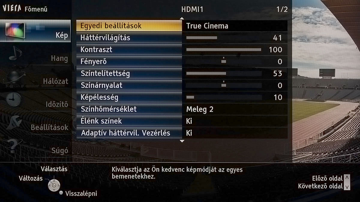 Szokás szerint a mérnököket túlzásokba hajszoló (túl fényes, túl színes, túl kontrasztos, túl éles) dinamikus színprofilon elegánsan átsiklottunk, a normál, a mozi és a True Cinema módok viszont alapesetben is használható eredményt adtak. Sőt, a True Cinema közel volt a tökéleteshez is (a kontraszt és a fekete tekintetében pedig ahhoz, amit egy IPS panelből ki lehet hozni). A beállításoknál közös hiba volt, hogy a Panasonic a képélességet SD tartalomhoz lőtte be, így a 0-100-as skálán a csúszka az 50-es értéken állt – ezt, ha HDMI bemenetet használunk, nyugodtan levehetjük 0-10 közé. Alapesetben aktív a dinamikus kontraszt és a fényerősséget a környezeti fényhez igazító szenzor is – ezeket szintén ajánlott kikapcsolni.