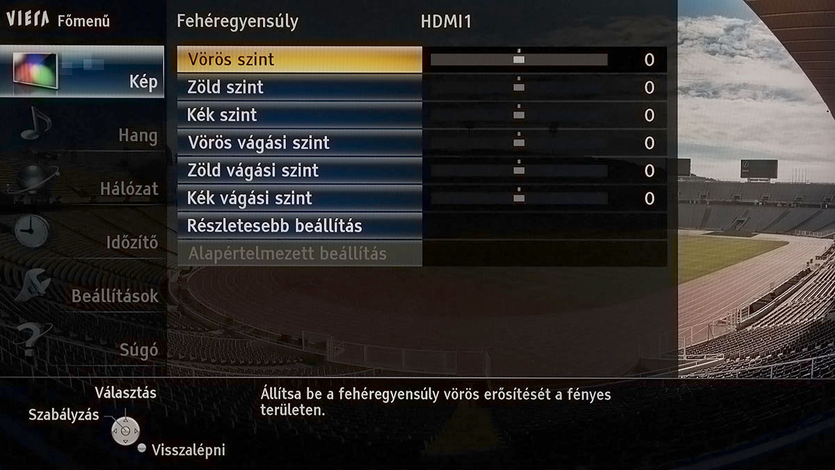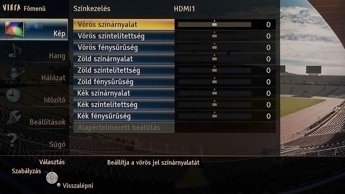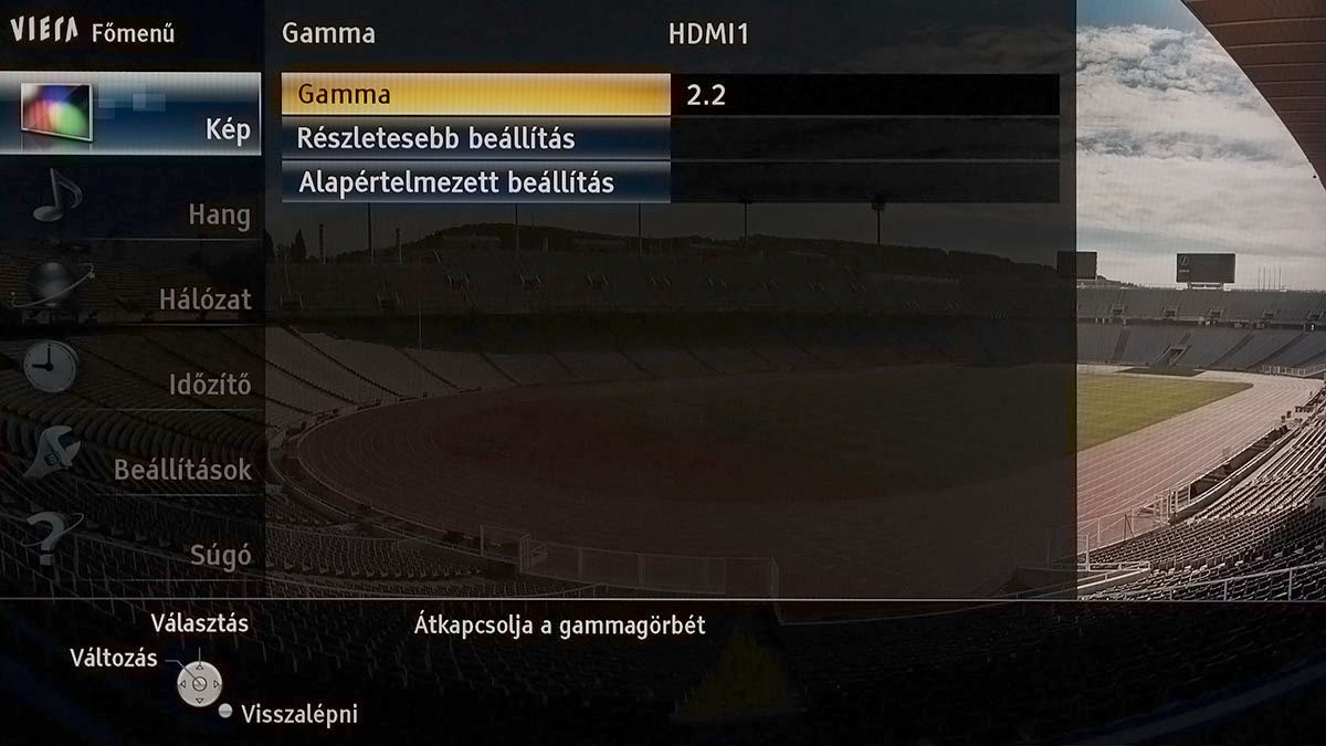 Az optimális beállításokat a True Cinema színprofilból kiindulva a következő helyen találtuk meg: háttérvilágítás 46, kontraszt 97, fényerő 0, színtelítettség 50, színárnyalat 2, képélesség 0-10 (SD tartalommal max. 30), színhőmérséklet meleg 2, élénk színek ki, adaptív háttérvilágítás ki, gamma 2,2. Ezekkel az értékekkel 6400K-s színhőmérsékletet, 2,5-ös átlagos deltaE-t és 5-ös maximális deltaE-t kaptunk, amelyek egytől egyik teljesen elfogadható értékek, ha azt is figyelembe vesszük, hogy a 10 pontos kalibrációs lehetőségekhez (fehéregyensúly és gamma) nem nyúltunk. Legfőképpen azért, hogy lássuk, mire megy az, aki kalibrációs műszer nélkül állítja be a tévét – valljuk be, ez szinte mindenkire jellemző. (Kalibráló eszközünk és a tévében lévő 10 pontos kalibráció segítéségével 60 százalékos fényerőig egyenletes, 2,2-es gammát, felette 2,1-es gammát, 2,0-s átlagos deltaE-t és 3,8-as maximális deltaE-t tudunk elérni.)