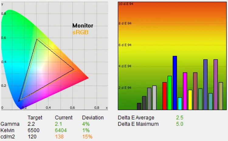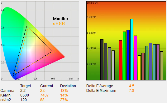 Ahogyan arra számítani lehetett, a fekete (és így a kontraszt) csak közepes, de egy IPS paneltől az 0,14 cd/m²-es illetve a 943:1 körüli értékek nem számítanak rossznak. Ami még fontos, az az, hogy a fényerősséget mérő szenzort mindenképpen kapcsoljuk ki, mert ellenkező esetben a gamma hajlamos nagyon „elcsúszni”.