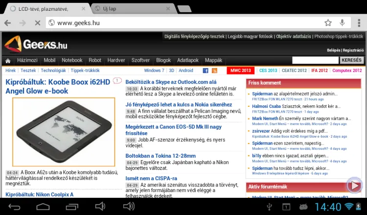A böngészési élménnyel komoly probléma – a Flasht leszámítva – egyik böngészővel sincsen, a tabletre fektetett helyzetben minden weboldal kifér, a kétmagos processzornak pedig a zoomolás és az összetettebb weboldalak megjelenítése sem jelent nagy kihívást. Egy képernyőre viszont, logikus módon, valamivel kevesebb adat fér el, mintha a tablet HD felbontású kijelzőt kapott volna.