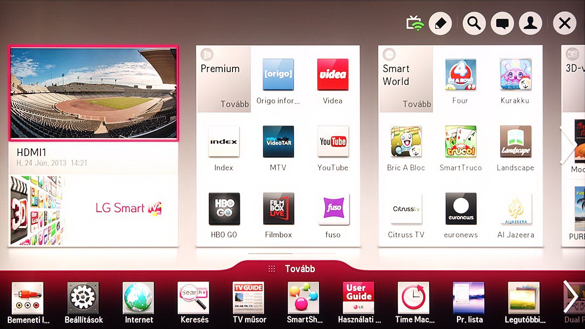 A prémium tartalmak között találjuk a magyar vonatkozású alkalmazásokat (origo, video, HBO Go, FilmBox Live, index, fuso, mtv VideoTár, port.hu) illetve néhány további VOD valamint a legnépszerűbb közösségi appokat (EuroSport, Daily Motion, MUSEUM, vTuner, iConcerts, AUPEO!, Skype, YouTube, Google Maps, facebook, AccuWeather, Picasa). Ahogy korábban is, ezeket az alkalmazásokat ingyenesen használhatjuk, de feltétel, hogy legyen LG-fiókunk, amibe természetesen be is kell lépni.
