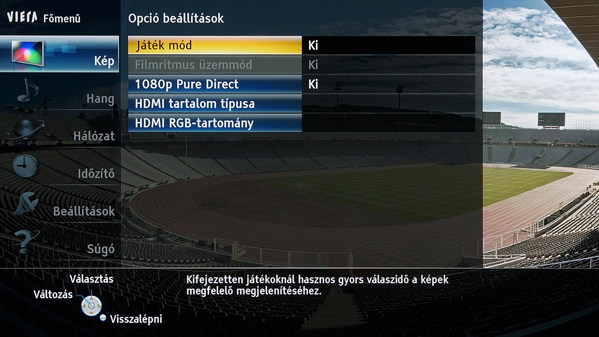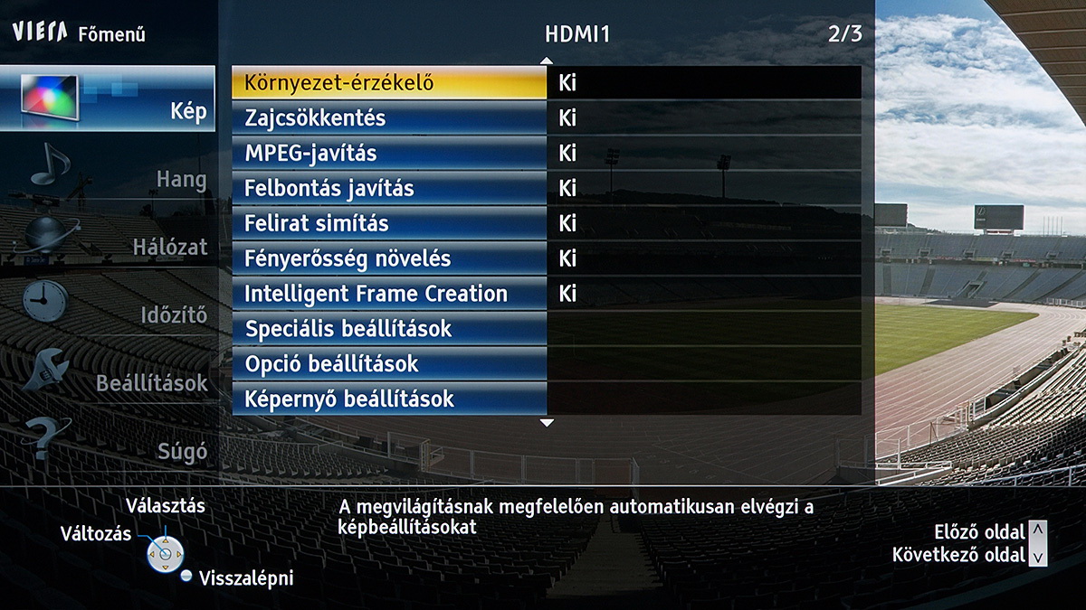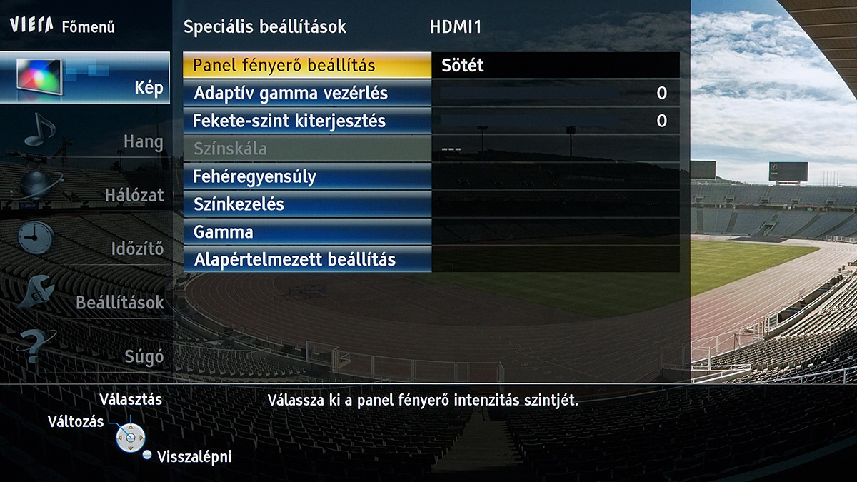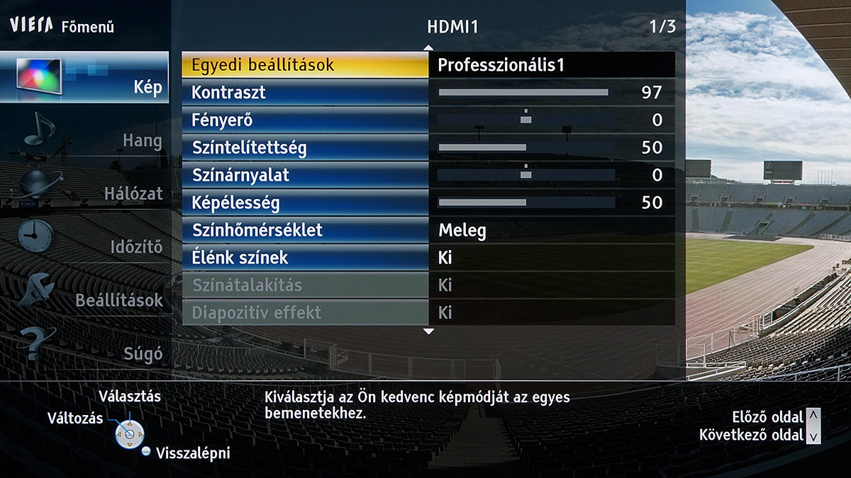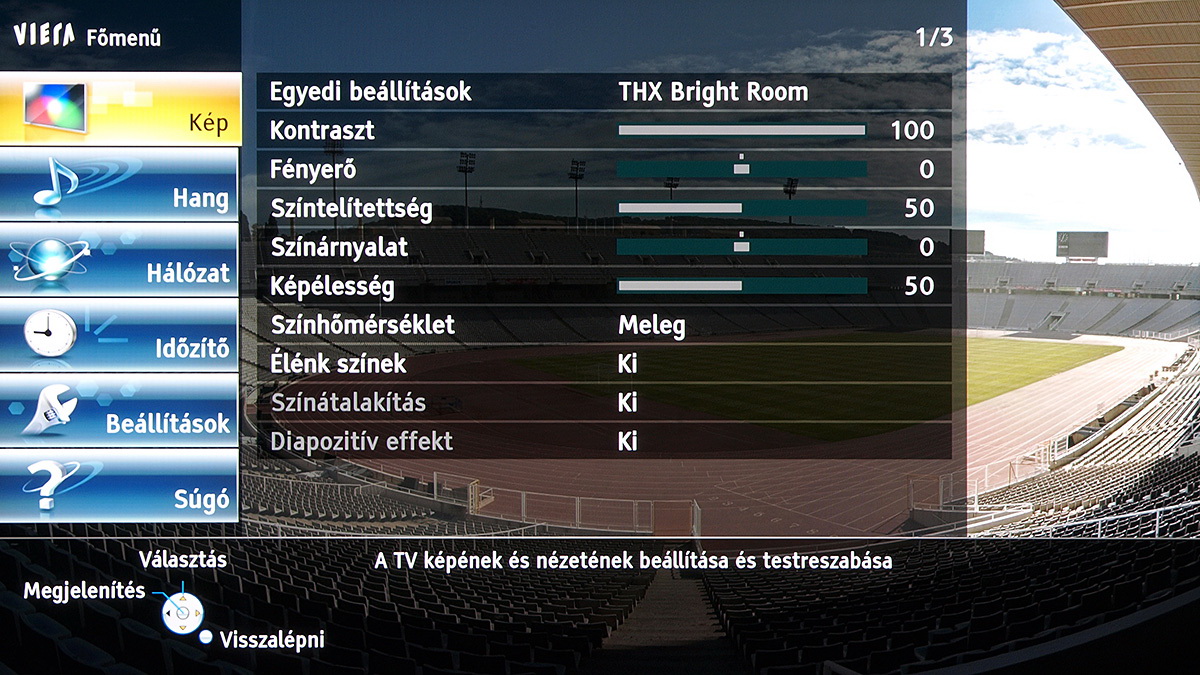 A készülékben a Panasonic saját képfeldolgozó egysége teljesít szolgálatot, amely néhány új trükkre is képes: A Resoltuion Remaster és a Brillance Enhancer például, különböző megközelítésből, a lokális kontrasztot növelik, a Caption Smoother pedig a képernyőn megjelenő feliratokat élesítik – ezek a megoldások azonban szükségszerűen úgy nyúlnak bele a képbe, hogy a színhelyességet és a gammát is rontják, ezért társaikhoz hasonlóan nem ajánljuk használatukat. A menü működése abból a szempontból tökéletes, hogy a paramétereket mindig olyan jellemzőkhöz köti, amelyekhez logikus: a HDMI módbeállítás például színprofiltól független, más paraméterek viszont a profillal együtt változnak, sőt, ha ugyanazt a színprofilt használjuk 2D és 3D módban, akkor adott esetben mindkét üzemmódra külön szettet választhatunk.