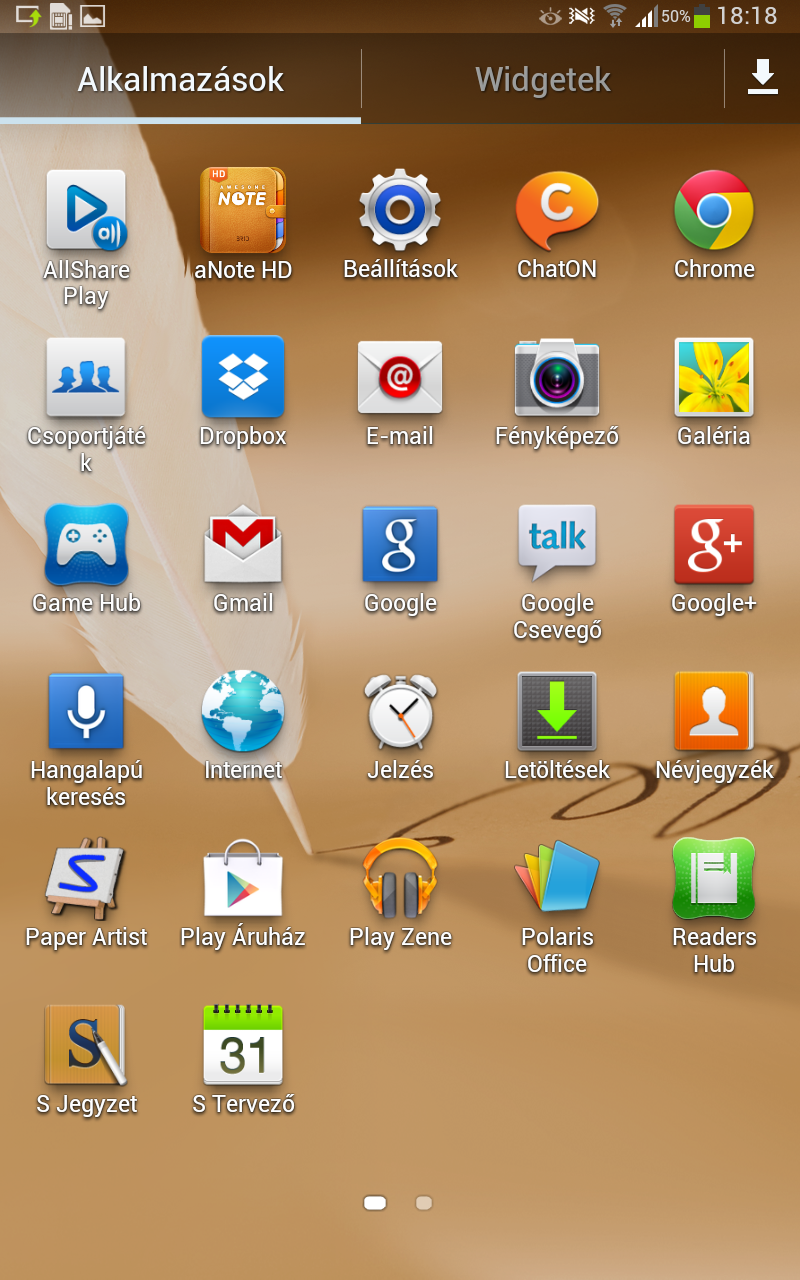 A Note 8.0 menüjében 2 oldalra kifértek az alkalmazások, pedig a Samsung sok extra programot ad a készülékéhez. Felsorolás szintjén a megszokott appok: AllShare Play, ChatON, Chrome, Csoportjáték, Dropbox (50 GB tárhellyel), GameHub, Polaris Office, S jegyzet, S tervező, S voice, Samsung Apps, Smart Remote, Világóra. Újdonságnak számít a Paper Artist, amely segítségével képeket tudunk kidekorálni, a Readers Hub segítségével pedig könyveket vásárolhatunk,