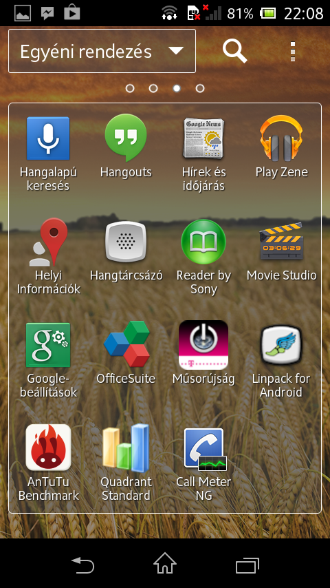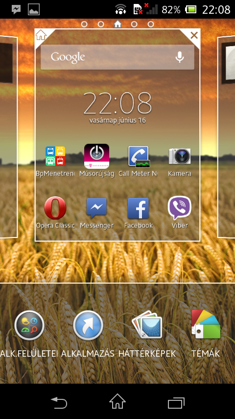 Kezdőképernyőből összesen hetet használhatunk, amelyek mindegyikén az alsó sorban fixen két parancsikon, a menü gomb majd ismét két parancsikon található meg – az itt helyet foglalható alkalmazások természetesen változtathatók. A hét képernyő közül a feleslegeseket eltávolíthatjuk, és azt is kiválaszthatjuk, hogy a Home gomb megnyomásakor melyik panelre ugorjon a telefon. Az alkalmazásokat és widgeteket 4×4-es rácson helyezhetjük el, a rendszerezéshez pedig mappákat is használhatunk. A kezdőképernyők átrendezéséhez, megtöltéséhez használatos felület remekül működik, és van néhány téma is, amelyek segítségével a megjelenést testreszabhatjuk.