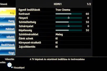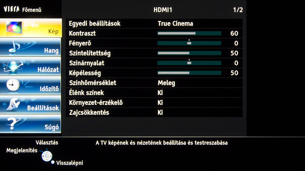 Fenti módosításokkal a True Cinema üzemmód 3,4-es átlagos és 7,2-es maximális deltaE-t, 2,2-es gammát, 6300K-s színhőmérsékletet és 91 cd/m²-es fényerőt , amely igen közel van a tökéleteshez – nyilván a szubjektív tényezőket ekkor még nem vettük figyelembe, ezeket, szokás szerint, a következő oldalon gyűjtöttük össze. A fekete fényerőssége 0,008 cd/m² volt, amely 11000:1 körüli kontrasztot jelent. Ez papíron jobb, mint a GT60-as kontrasztja, az igazság azonban az, hogy szabad szemmel nem igazán lehet megkülönböztetni azt a feketét, amelyet a GT60-as illetve amelyet az ST60-as tévék tudnak, még fej-fej mellett sem – sőt, nyugodtan idevehetjük még a VT60-asokat is, a maguk 0,005 cd/m²-es feketéjükkel.