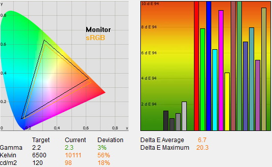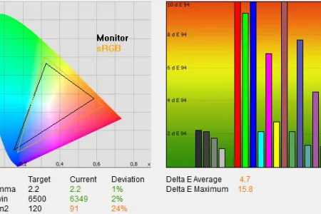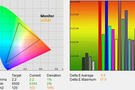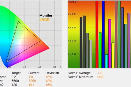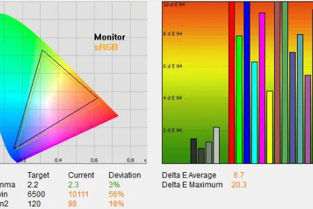 A kezdeti ismerkedés után ezúttal is a gyári színprofilok elemzésével kezdtük a tesztet, és a gyakorlat beigazolta azokat a várakozásokat, amely szerint az ST60-as egyik hátránya a nagyobb testvérekkel szemben az, hogy a színprofilok gyárilag nem túl pontosak. Színprofilok terén a Panasonic a szokásos kínálatot vonultatta fel (dinamikus, normál, mozi és True Cinema profilok), ám 3 alatti deltaE-t egyik esetben sem mértünk, a legjobb, 4,7-es érték azt jelenti, hogy csekély eltérés van a megjelenített és az elvárt színek között. A viszonylag nagy értéket az okozta, hogy a vörös komponens a kelleténél valamivel erősebb, a kék és zöld pedig gyengébb volt, de szerencsére mindhárom színnél csak 60 százalékos fényerő felett volt nagy az eltérés, így a vörös túlszaturáltsága szabad szemmel alig volt érzékelhető. A tévé a rengeteg a finombeállítási lehetőséggel és egy műszer segítségével teljesen jól beállítható egyébként, akár 2 alatti deltaE sem lehetetlen – viszont ennek mikéntjéhez általános útmutatót sajnos ezúttal sem tudunk adni (minden egyes készülék eltér picit), a pontos beállításhoz tényleg kell a kalibrátor.