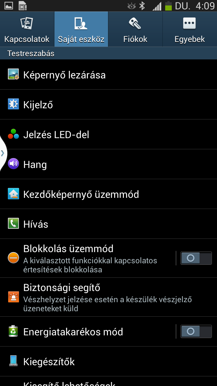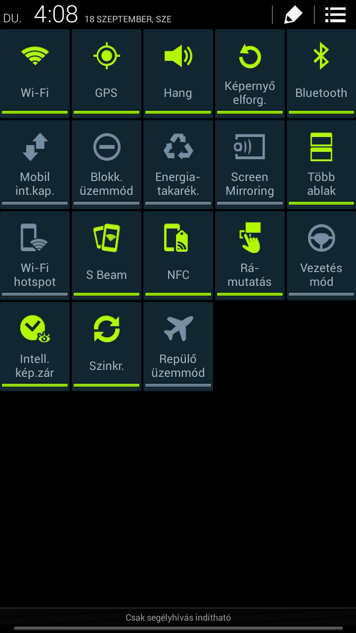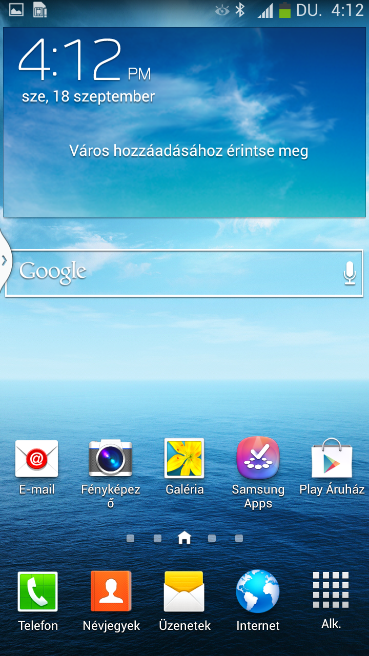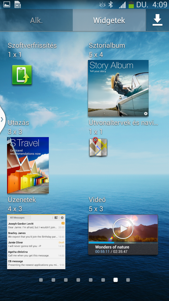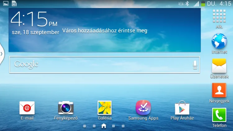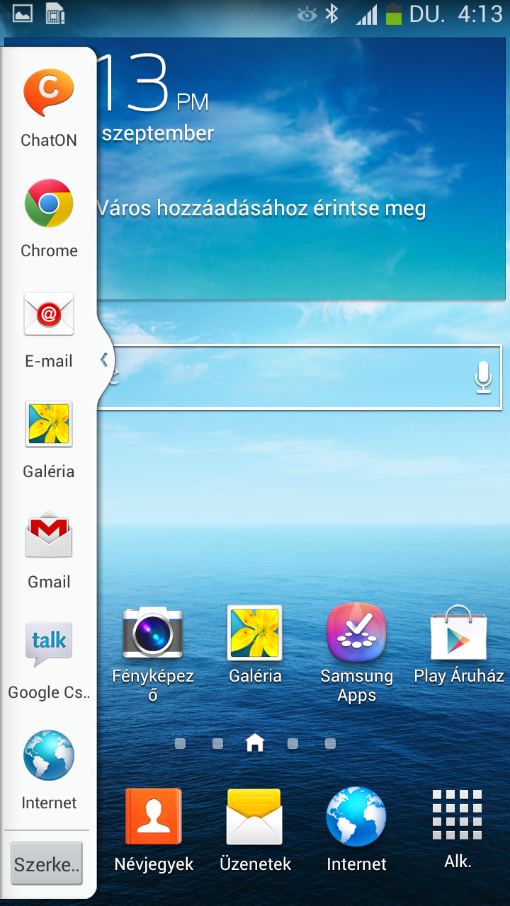 Egyébként a gyakran használat programoknak egy másik helye is van: balról behúzható egy vékony, egy ikonnyi szélességű sáv, amelyre további kedvenc alkalmazásokat helyezhetünk. Főképernyőből összesen hetet használhatunk; ha viszont ennyire nincs szükség, akkor a feleslegeseket eltávolíthatjuk. A panelek közül bármelyik lehet alapértelmezett, a jobb szélről pedig, ha továbblapozunk, akkor átugorhatunk a bal szélső képernyőre. Bár ahogyan korábban írtuk, a Samsung alapvetően telefonként tekint a Galaxy Mega 6.3-ra, apróságok azért jelzik, hogy a vállalatnál is tisztában vannak azzal, hogy minimum egy phablet az, ami kikerült a tervezőasztalról; ilyen például az, hogy telefon vízszintes helyzetéhez a kezdőképernyők is igazodnak, valamint az, hogy van egykezes üzemmód is.