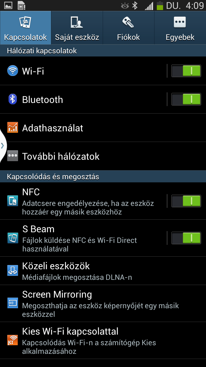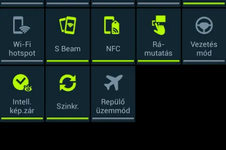 Állapotjelző sávból kettő is van (ez Android 4.2 újdonság): az eddig megszokott normál verzió mellett átkapcsolhatunk egy az egész kijelzőt kitöltő, funkciógombokat tartalmazó panelre is. Ezt a felületet egyébként úgy is előhívhatjuk, hogy az értesítési sávot nem egy, hanem két ujjal húzzuk le. A szokásos opciók mellett itt kapcsolhatjuk ki-be az intelligens képernyőzárat, az NFC-t, stb.