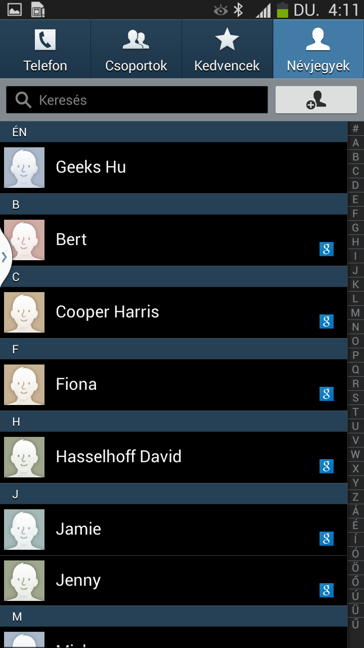 A többi androidos készülékhez hasonlóan a beírt betűkből, számokból a ténylegesen hívni kívánt ismerőst kitaláló Smart dial is megtalálható a mobilban, és a névlistában a TouchWiz extrái is adnak egy kis pluszt: egy kontakt nevén balra húzva az ujjunkat SMS-t küldhetünk, jobbra húzva felhívhatjuk, ha pedig a csatolt képre kattintunk, akkor egy gyorsmenü ugrik fel, további opciókkal.