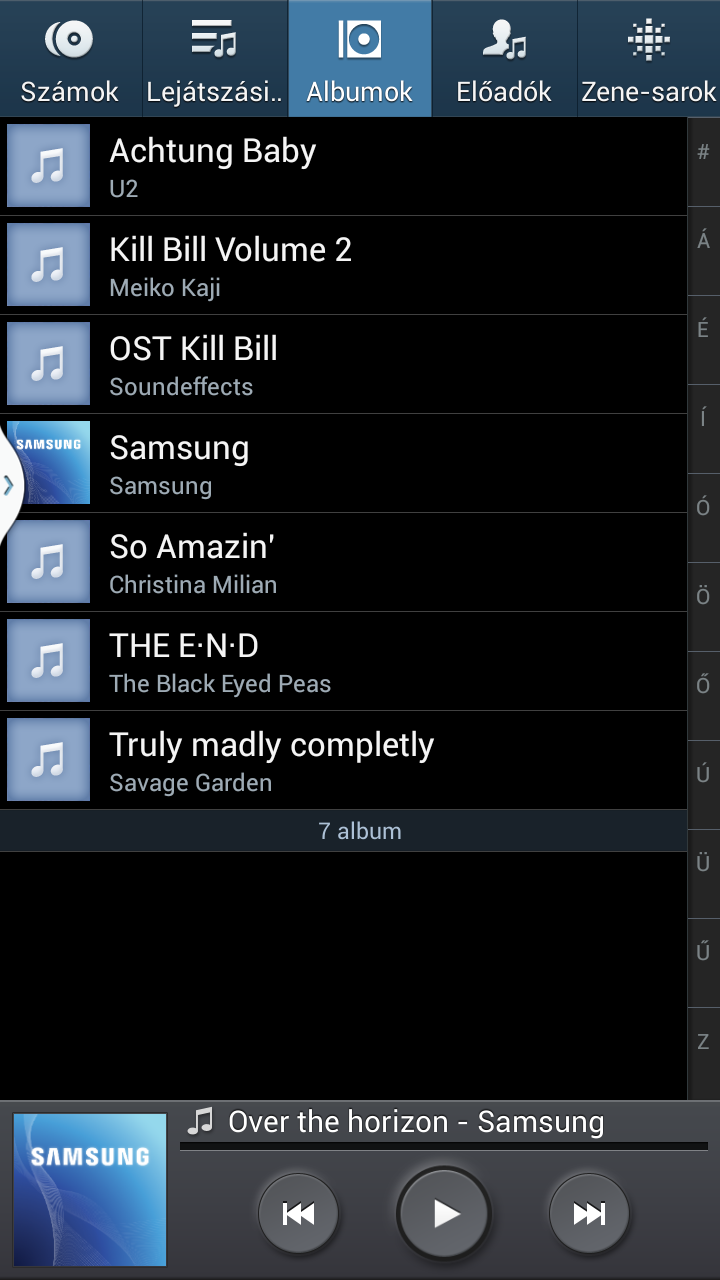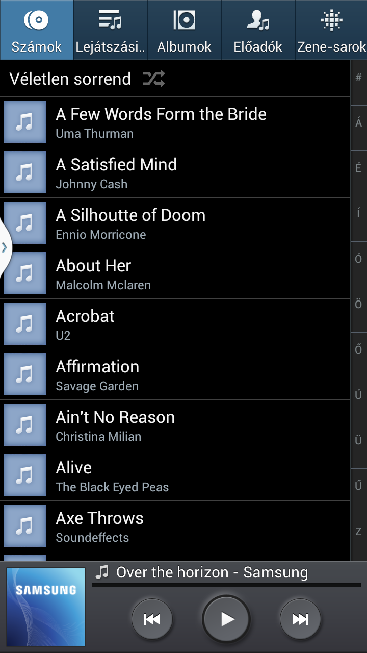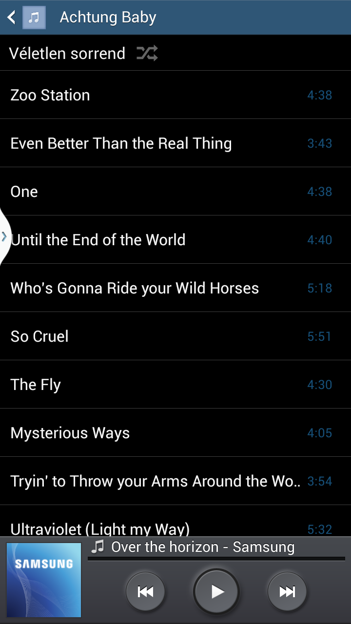 Zenehallgatásra a megszokott Samsung zenelejátszó áll rendelkezésünkre, amely az ID3 tagekben lévő információk alapján szűri zeneszámainkat, és az albumborítókat is megjeleníti. Hangszínszabályzásra is van lehetőségünk, a hangzás pedig, egy jó fülessel, egészen kiváló.