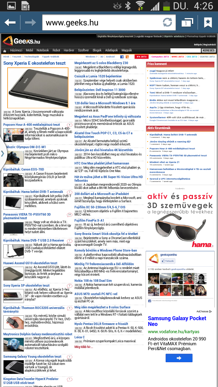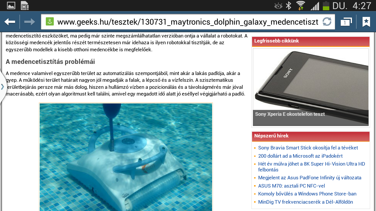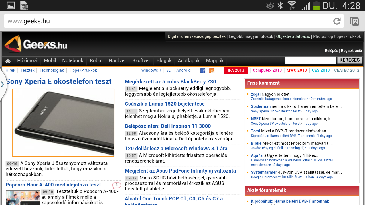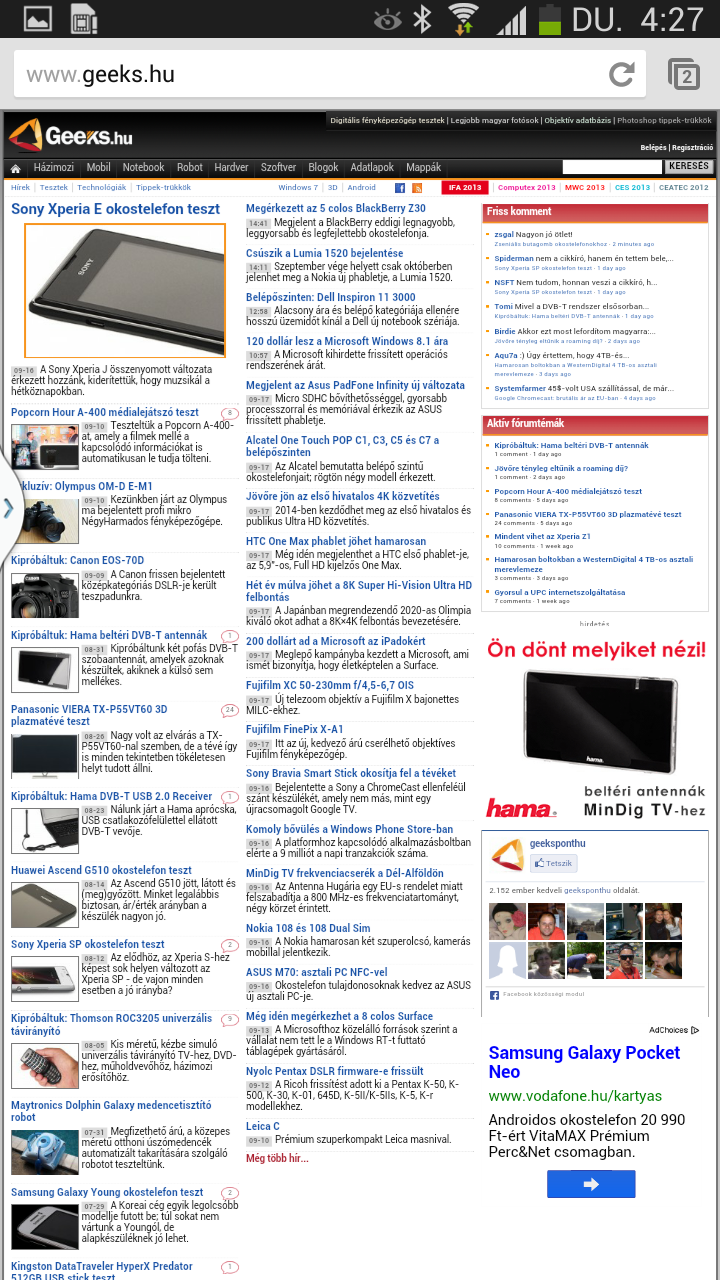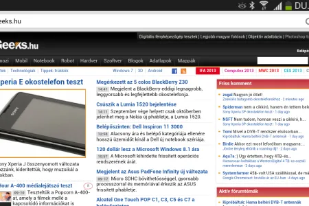 A gyári alap böngésző Internet néven fut, ezzel van lehetőség kihasználni a legyezős lapozást és az intelligens görgetést, valamint a szoftver képes a szövegeket is újratördelni. Más kérdés, hogy erre igazából semmi szükség, a 6,3 colos képátló és az 1280×720 pixeles felbontás együtt, főleg, ha a telefont fektetve használjuk, tökéletesen alkalmas arra, hogy az internetes oldalakat teljes méretben is olvashatóan nyissuk meg. is. A készüléken természetesen felbukkan a Chrome is, amelynek előnye, hogy az előzmények, a kedvencek és a megnyitott fülek szinkronizálhatók Google fiókunkkal (vagyis más eszközeinkkel).
