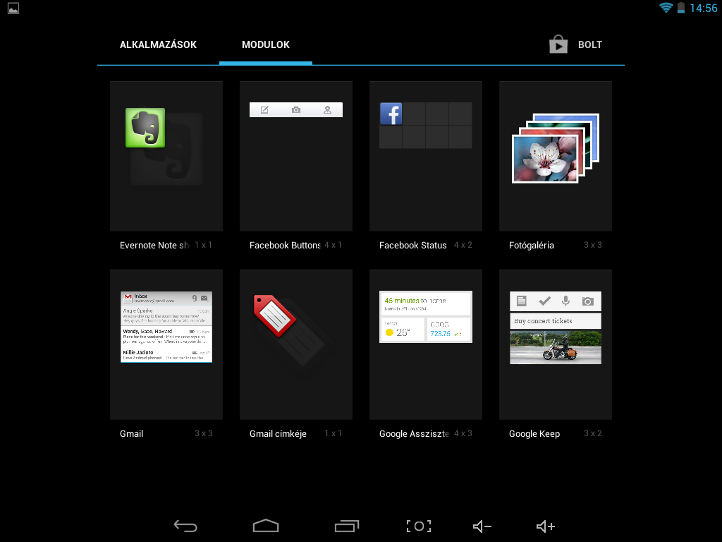 Ami a Google saját appjait illeti, a készülékre felkerült a WebKit alapú Böngésző (Flash támogatással), a Drive, a Gmail, a kereső és a hangalapú kereső, a Google+, a Helyi információk (Locations), a Keep és a YouTube is, valamint megkapjuk az Android alapprogramjait a multimédiás fájlok kezeléséhez.