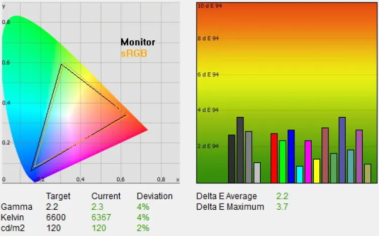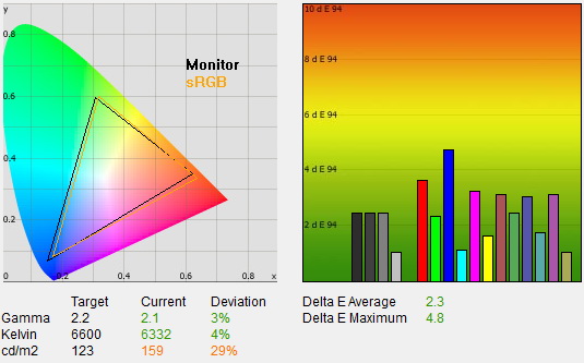Az optimális beállításokat az ifs Nappali profilból kiindulva kerestük meg. A fényerősségen és a kontraszton nem változtattunk, a képélesítést viszont 0-ra vettük a fekete szintet pedig a forrásnak (PC) megfelelően magasra állítottuk. Sajnos kalibrátor nélkül a gammát nem tudtuk teljesen tökéletesre belőni (kalibrátorral és a gammakorrekcióval viszont igen), az eredmény azonban csak nagyon kis mértékben tért el az optimálistól, így igazán nagy problémát ez nem okoz. A végeredmény egészen kellemes lett, 120 cd/m²-es fényerő, 6400K-s színhőmérséklet, 2,3-as gamma és 1791:1-es kontraszt a mért értékek, az átlagos deltaE pedig mindössze 2,2 volt, ami azt jelenti, hogy a megjelenített színek és az elvárt árnyalatok között olyan kicsi a különbség, hogy azt szabad szemmel nem igazán lehet észrevenni.