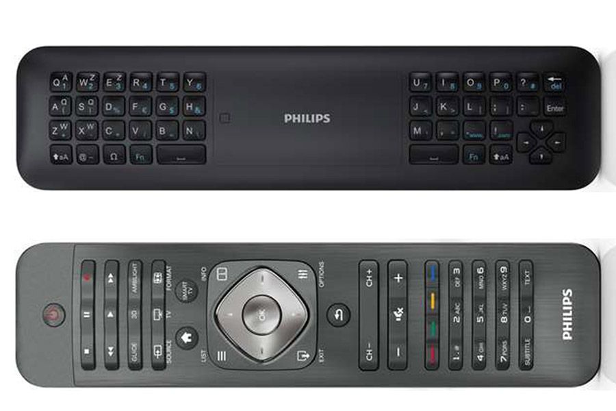 A távirányító érdekes példány, mert a megszokottnál jóval több funkciót nyújt. Egyrészt kétoldalas, ezen túlmenően pedig már a klasszikus funkciókat nyújtó rész önmaga is bír egy extrával: ha megérintjük az OK gombot, akkor a kontrollert egy levegőben működő egérként tudjuk használni. A másik oldalra egy qwerty klaviatúra és egy touchpad került, ezeknek (valamint a légegérnek) logikus módon elsősorban akkor vehetjük hasznát, ha az okostévé funkciókat szeretnénk kihasználni. A távirányító ezen kívül egyedi azért is, mert nem infrás összeköttetést használ, hanem rádiofrekvenciás kapcsolatot létesít a tévével. A távvezérlő kialakítása anyaghasználat szempontjából első osztályú (előlapja fémből készült példádul), a gombok leütési útját viszont túl rövidnek találtuk.