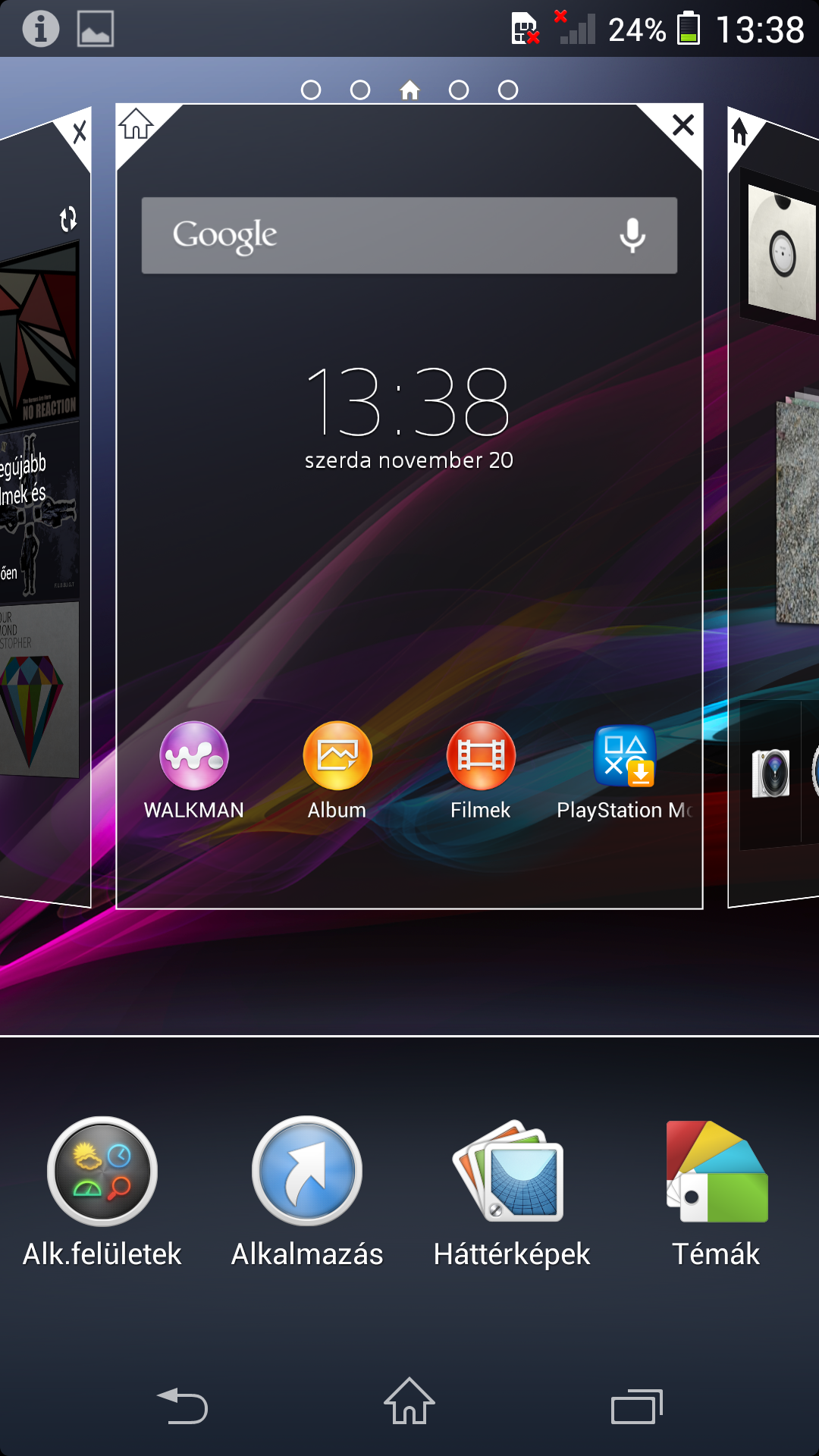 A lezáró képernyőt és a főképernyőt cserélte a Sony, ahogyan a programok ikonjait is. Az Androidot szokás azért dicsérni, hogy alapból is egy nagyon jól használható felületet ad vele a Google, de Sony módosításai, ha lehet, még kényelmesebbé teszik a használatot. A feloldó képernyő nekünk például egyértelműen jobban tetszett: a Sony Xperia Z1-en elég, ha csak függőlegese végigsimítjuk a kezünket a kijelzőn, nem kell még arra is figyelni, hogy melyik pontból indítjuk a mozdulatot. Emellett a felület meghagyja a fényképező közvetlen indításának valamit a zenelejátszó vezérlésének a lehetőségét is, és persze az Android 4.2-ben lévő készenléti widgeteket is elérhetjük, amelyeket a mérnököknek sikertült nagyon elegánsan, cseppet sem hivalkodó módon elhelyezni.