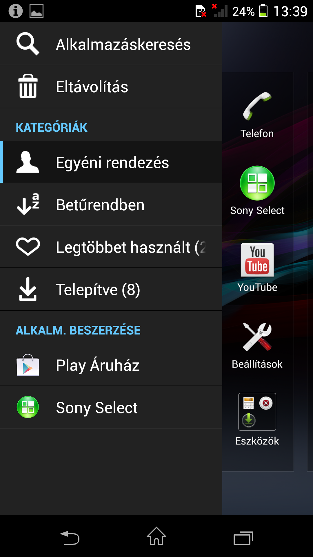 Az Xperia Z-n az Android 4.2.2-es verziója fut, de nem a gyári interfésszel, hiszen a készülékre természetesen rátelepszik a Sony saját UI-ja is. Aki látott már idén vagy tavaly Sony készüléket, az tudja, hogy mindez nem azt jelenti, hogy a gyártó az operációs rendszer minden külső elemét lecserélte volna; a Sony apróságokat módosított csak, nem nyúlt annyira drasztikusan hozzá a felhasználói élményhez, mint mondjuk a Samsung vagy a HTC. A menü például maradt szinte teljesen azonos a Holo felületben megszokottal, igaz, a 4.2-es Android mellé a Sony már nem fekete, hanem fehér hátteret használ.