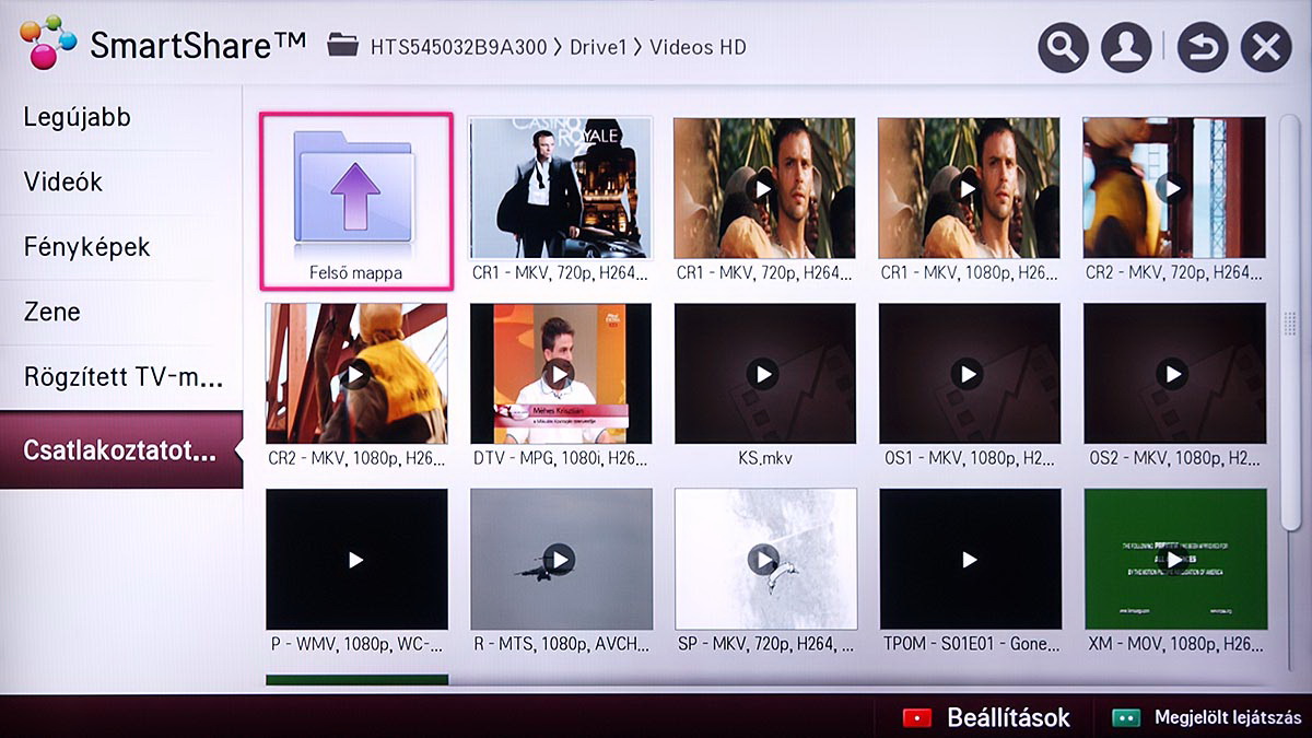 A médialejátszó a Home képernyőről indítható el, és SmartShare névre hallgat. Az LG a különféle források kezelését kiválóan oldotta meg, mert gyakorlatilag a forrástól független, hogyan használhatjuk a médialejátszót. A USB-re csatlakoztatott merevlemezek, a mobil eszközök és a hálózaton (DLNA kapcsolat segítségével) elérhető eszközök (PC, NAS, stb.), mind ugyanazt a felületet használják, sőt, az LG megoldotta azt is, hogy egyszerre több adathordozót is használhassunk. A felület ennek megfelelően változott, nem is kicsit.